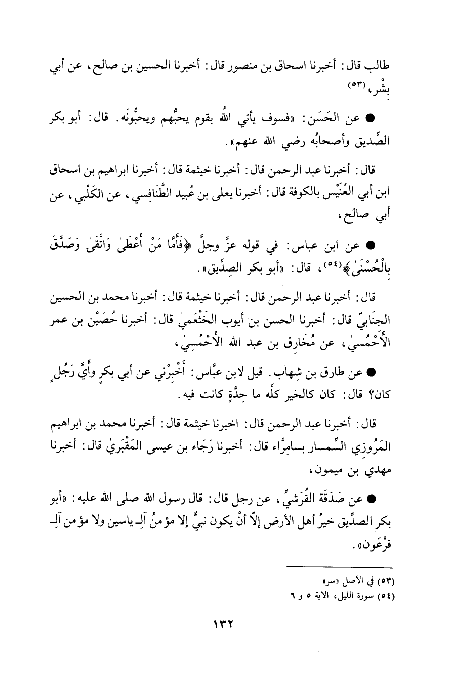 قَالَ: أَخْبَرَنَا عَبْدُ الرَّحْمَنِ , قَالَ: , قَالَ: أَخْبَرَنَا مُحَمَّدُ بْنُ إِبْرَاهِيمَ الْمَرْوَزِيُّ السِّمْسَارُ , بِسَامَرَّاءَ قَالَ: أَخْبَرَنَا رَجَاءُ بْنُ عِيسَى الْمَقْبُرِيُّ , قَالَ: أَخْبَرَنَا مَهْدِيُّ بْنُ مَيْمُونٍ , عَنْ صَدَقَةَ الْقُرَشِيِّ , عَنْ رَجُلٍ , قَالَ: قَالَ رَسُولُ اللَّهِ صَلَّى اللهُ عَلَيْهِ وَسَلَّمَ: «§أَبُو بَكْرٍ الصِّدِّيقُ خَيْرُ أَهْلِ الْأَرْضِ , إِلَّا أَنْ يَكُونَ نَبِيُّ , إِلَّا مُؤْمِنُ آلِ يَاسِينَ وَلَا مُؤْمِنُ آلِ فِرْعَوْنَ»