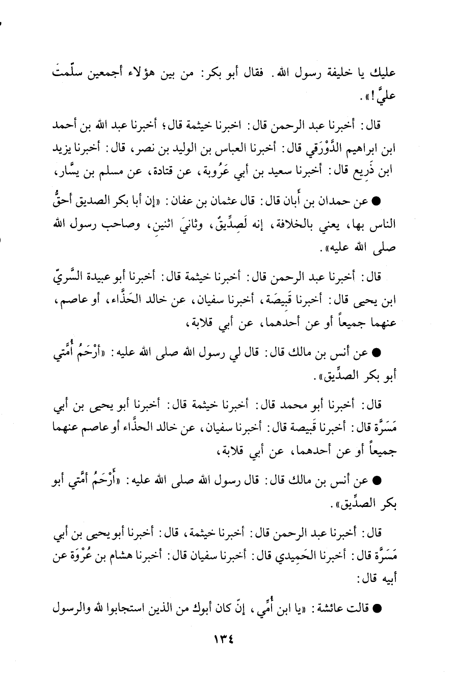 أَخْبَرَنَا أَبُو عُبَيْدَةَ السَّرِيُّ بْنُ يَحْيَى , قَالَ: أَخْبَرَنَا قَبِيصَةُ , أَخْبَرَنَا سُفْيَانُ , عَنْ خَالِدٍ الْحَذَّاءِ , أَوْ عَاصِمٍ , عَنْهُمَا جَمِيعًا , أَوْ عَنْ أَحَدِهِمَا , عَنْ أَبِي قِلَابَةَ , عَنْ أَنَسِ بْنِ مَالِكٍ قَالَ: قَالَ لِي رَسُولُ اللَّهِ صَلَّى اللهُ عَلَيْهِ وَسَلَّمَ: «§أَرْحَمُ أُمَّتِي أَبُو بَكْرٍ الصِّدِّيقُ»