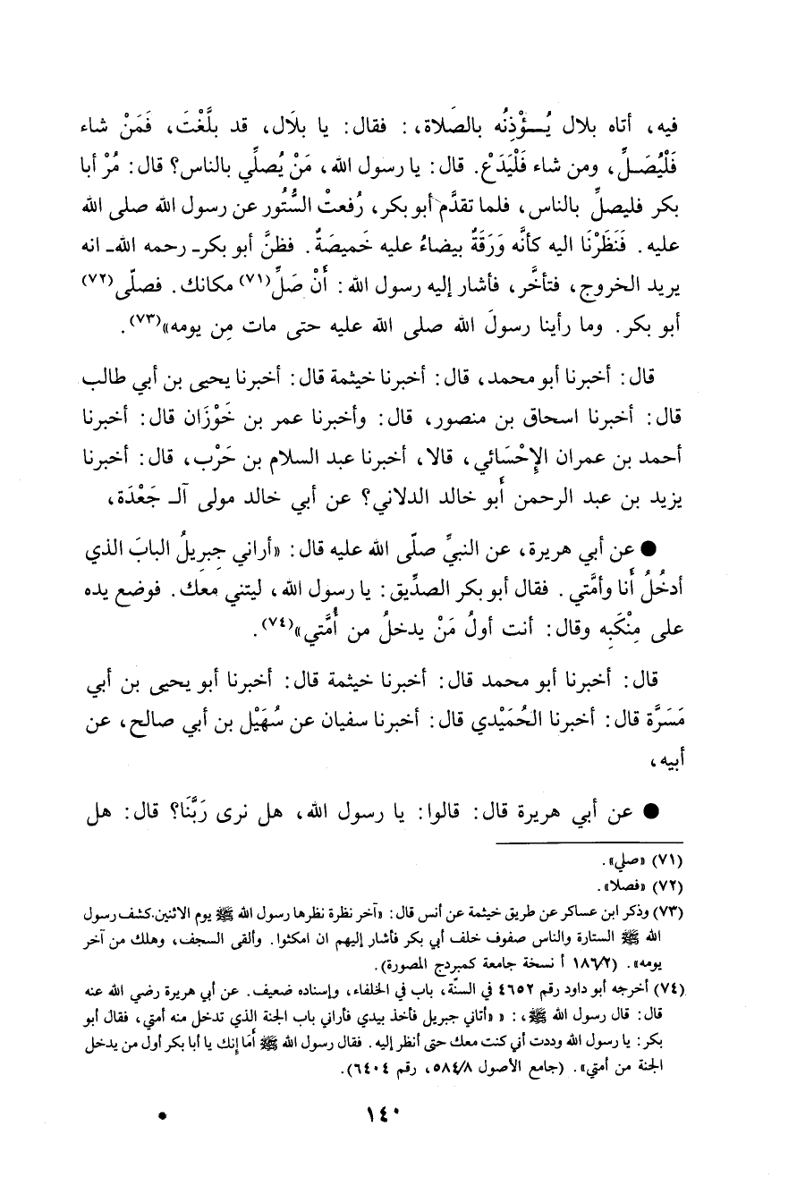 قَالَ: أَخْبَرَنَا أُبُو مُحَمَّدٍ قَالَ: أَخْبَرَنَا خَيْثَمَةُ قَالَ: أَخْبَرَنَا يَحْيَى بْنُ أَبِي طَالِبٍ , قَالَ: أَخْبَرَنَا إِسْحَاقُ بْنُ مَنْصُورٍ , قَالَ: وَأَخْبَرَنَا عُمَرُ بْنُ خَوْزَانَ , قَالَ: أَخْبَرَنَا أَحْمَدُ بْنُ عِمْرَانَ الْإِحْسَائِيُّ , قَالَا: أَخْبَرَنَا عَبْدُ السَّلَامِ بْنُ حَرْبٍ , قَالَ: أَخْبَرَنَا يَزِيدُ بْنُ عَبْدِ الرَّحْمَنِ أَبُو خَالِدٍ الدَّالَانِيُّ , عَنْ أَبِي خَالِدٍ , مَوْلَى آلِ جَعْدَةَ , عَنْ أَبِي هُرَيْرَةَ , عَنِ النَّبِيِّ صَلَّى اللهُ عَلَيْهِ وَسَلَّمَ قَالَ: «§أَرَانِي جِبْرِيلُ الْبَابَ الَّذِي أَدْخُلُ أَنَا وَأُمَّتِي» , فَقَالَ أَبُو بَكْرٍ الصِّدِّيقُ: يَا رَسُولَ اللَّهِ , لَيْتَنِي مَعَكَ , فَوَضَعَ يَدَهُ عَلَى مَنْكِبِهِ وَقَالَ: «أَنْتَ أَوَّلُ مَنْ يَدْخُلُ مِنْ أُمَّتِي»