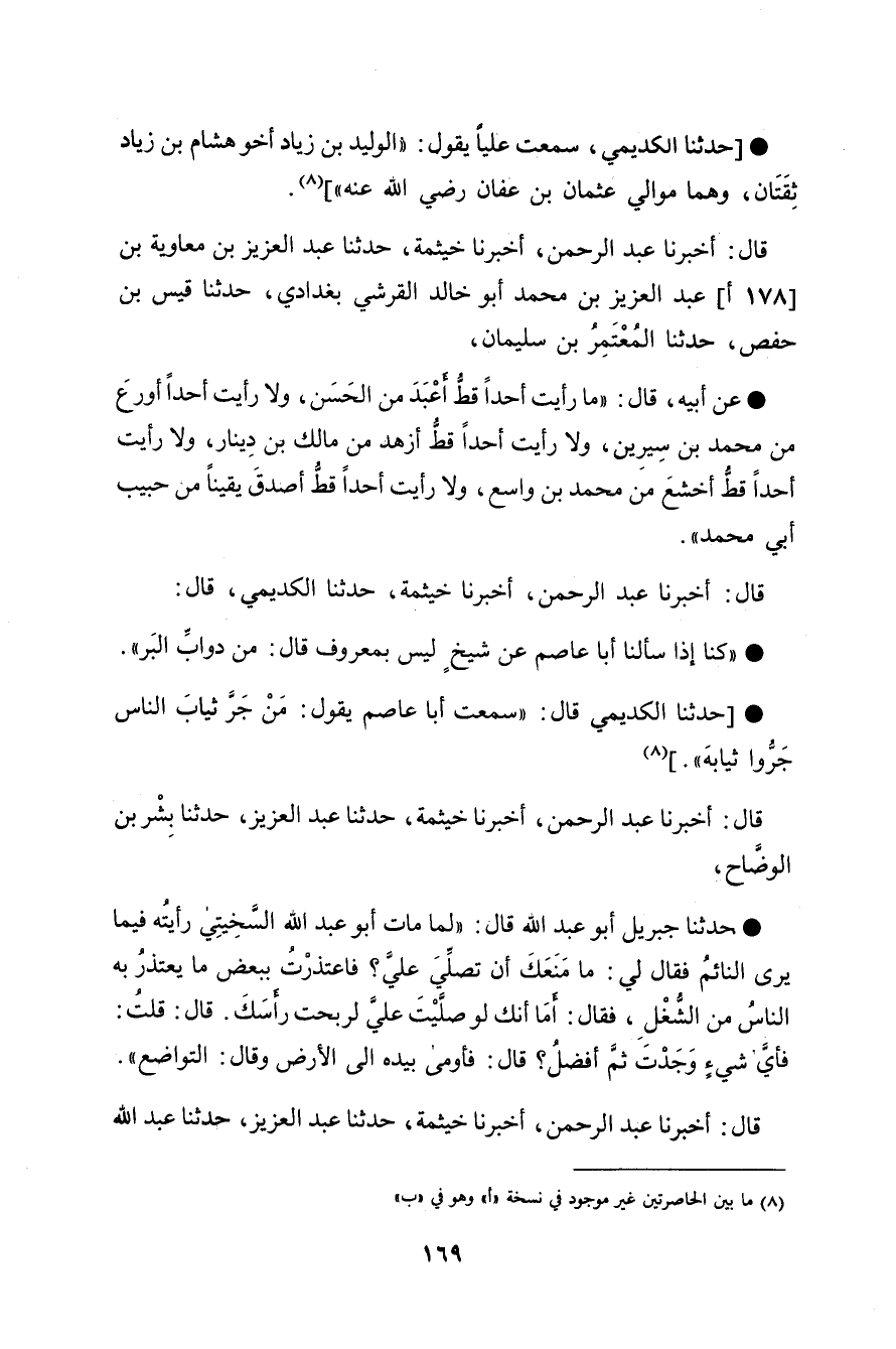 حَدَّثَنَا عَبْدُ الْعَزِيزِ حَدَّثَنَا بِشْرُ بْنُ الْوَضَّاحِ حَدَّثَنَا جِبْرِيلُ أَبُو عَبْدِ اللَّهِ , قَالَ: §لَمَّا مَاتَ أَبُو عَبْدِ اللَّهِ السَّخِيتِيُّ رَأَيْتُهُ فِيمَا يَرَى النَّائِمُ , فَقَالَ لِي: مَا مَنَعَكَ أَنْ تُصَلِّيَ عَلَيَّ؟ فَاعْتَذَرْتُ بِبَعْضِ مَا يَعْتَذِرُ بِهِ النَّاسُ مِنَ الشُّغْلِ , فَقَالَ: أَمَا إِنَّكَ لَوْ صَلَّيْتَ عَلَيَّ لَرَبِحْتَ رَأْسَكَ , قَالَ: قُلْتُ: فَأَيَّ شَيْءٍ وَجَدْتَ ثَمَّ أَفْضَلَ؟ قَالَ: فَأَوْمَى بِيَدِهِ إِلَى الْأَرْضِ وَقَالَ: التَّوَاضُعُ