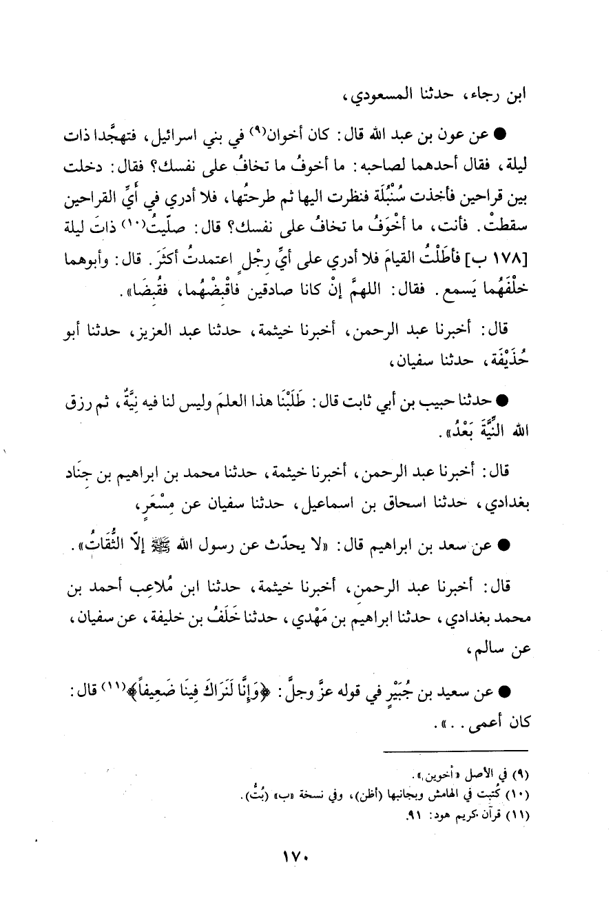 حَدَّثَنَا مُحَمَّدُ بْنُ إِبْرَاهِيمَ بْنِ جِنَادٍ بَغْدَادِيٌّ حَدَّثَنَا إِسْحَاقُ بْنُ إِسْمَاعِيلَ حَدَّثَنَا سُفْيَانُ عَنْ مِسْعَرٍ , عَنْ سَعْدِ بْنِ إِبْرَاهِيمَ , قَالَ: §لَا يُحَدِّثُ عَنْ رَسُولِ اللَّهِ صَلَّى اللهُ عَلَيْهِ وَسَلَّمَ إِلَّا الثِّقَاتُ