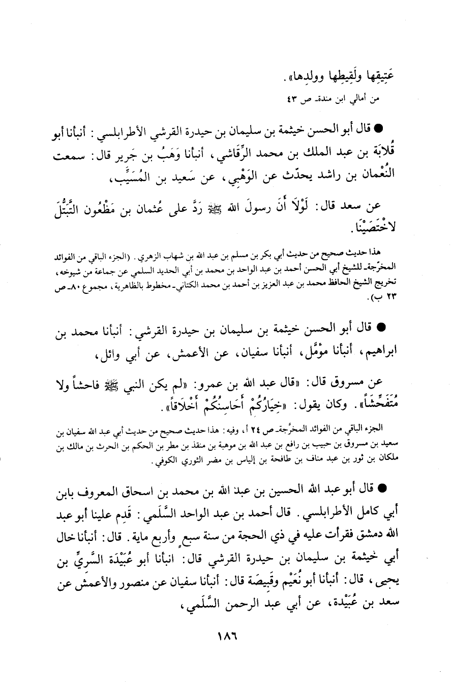 أَنْبَأَنَا أَبُو قِلَابَةَ بْنُ عَبْدِ الْمَلِكِ بْنِ مُحَمَّدٍ الرَّقَاشِيُّ , أَنْبَأَنَا وَهْبُ بْنُ جَرِيرٍ , قَالَ: سَمِعْتُ النُّعْمَانَ بْنَ رَاشِدٍ , يُحَدِّثُ عَنِ الْوَهْبِيِّ , عَنْ سَعِيدِ بْنِ الْمُسَيِّبِ , عَنْ سَعْدٍ , قَالَ: §لَوْلَا أَنَّ رَسُولَ اللَّهِ صَلَّى اللهُ عَلَيْهِ وَسَلَّمَ رَدَّ عَلَى عُثْمَانَ بْنِ مَظْعُونٍ التَّبَتُّلَ لَاخْتَصَيْنَا