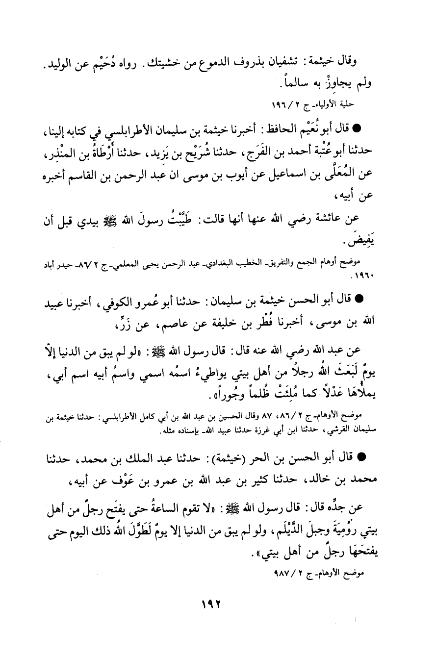 حَدَّثَنَا أَبُو عَمْرٍو الْكُوفِيُّ , أَخْبَرَنَا عُبَيْدُ اللَّهِ بْنُ مُوسَى , أَخْبَرَنَا فِطْرُ بْنُ خَلِيفَةَ , عَنْ عَاصِمٍ , عَنْ زِرٍّ , عَنْ عَبْدِ اللَّهِ , رَضِيَ اللَّهُ عَنْهُ قَالَ: قَالَ رَسُولُ اللَّهِ صَلَّى اللهُ عَلَيْهِ وَسَلَّمَ: «§لَوْ لَمْ يَبْقَ مِنَ الدُّنْيَا إِلَّا يَوْمٌ لَبَعَثَ اللَّهُ رَجُلًا مِنْ أَهْلِ بَيْتِي يُوَاطِئُ اسْمُهُ اسْمِي , وَاسْمُ أَبِيهِ اسْمَ أَبِي , يَمْلَأُهَا عَدْلًا كَمَا مُلِئَتْ ظُلْمًا وَجَوْرًا»