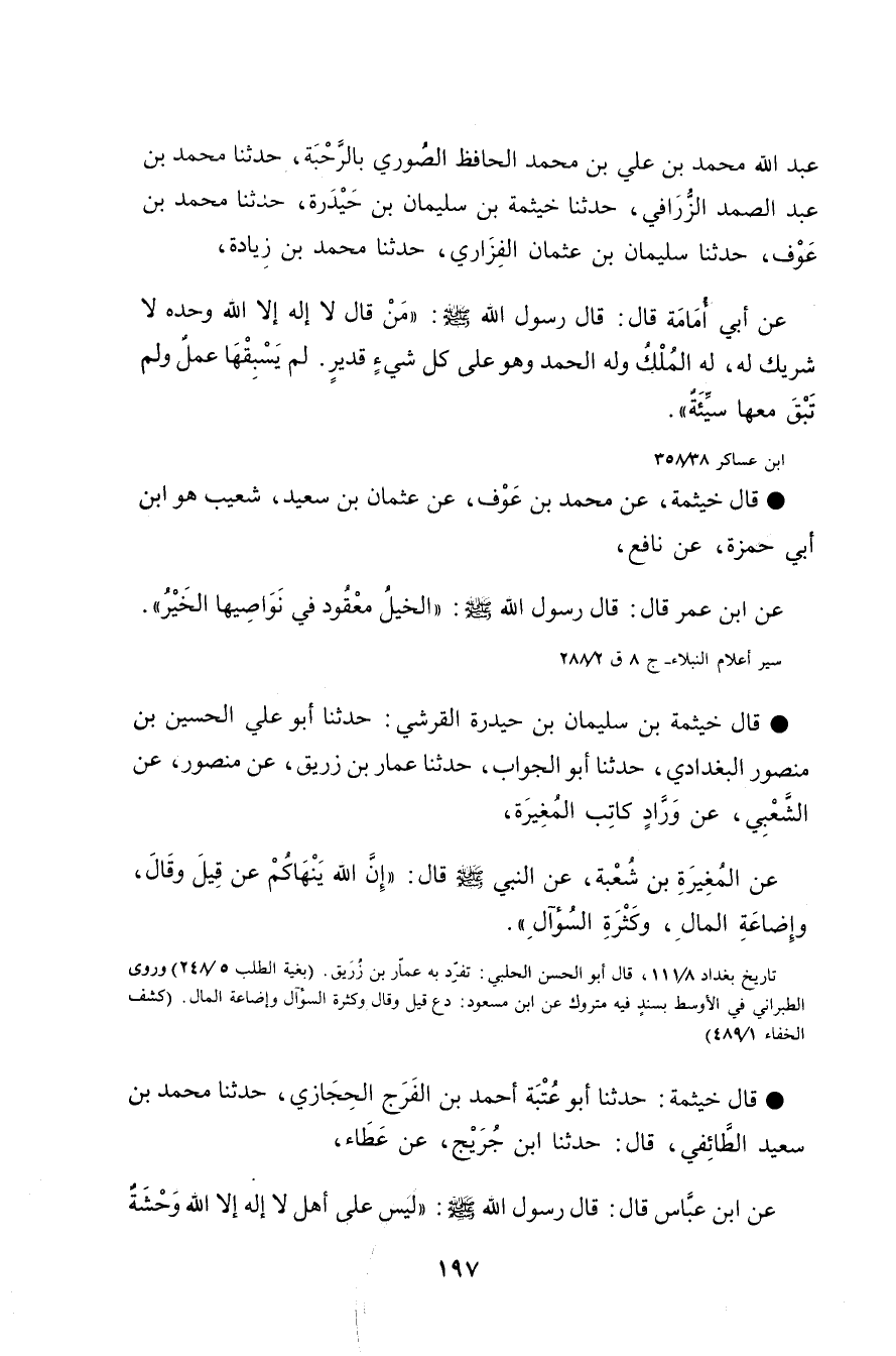 حَدَّثَنَا أَبُو عَلِيٍّ الْحُسَيْنُ بْنُ مَنْصُورٍ الْبَغْدَادِيُّ , حَدَّثَنَا أَبُو الْجَوَّابِ , حَدَّثَنَا عَمَّارُ بْنُ زُرَيْقٍ , عَنْ مَنْصُورٍ , عَنِ الشَّعْبِيِّ , عَنْ وَرَّادٍ , كَاتَبِ الْمُغِيرَةِ , عَنِ الْمُغِيرَةِ بْنِ شُعْبَةَ , عَنِ النَّبِيِّ صَلَّى اللهُ عَلَيْهِ وَسَلَّمَ قَالَ: «§إِنَّ اللَّهَ يَنْهَاكُمْ عَنْ قِيلَ وَقَالَ , وَإِضَاعَةِ الْمَالِ , وَكَثْرَةِ السُّؤَالِ»