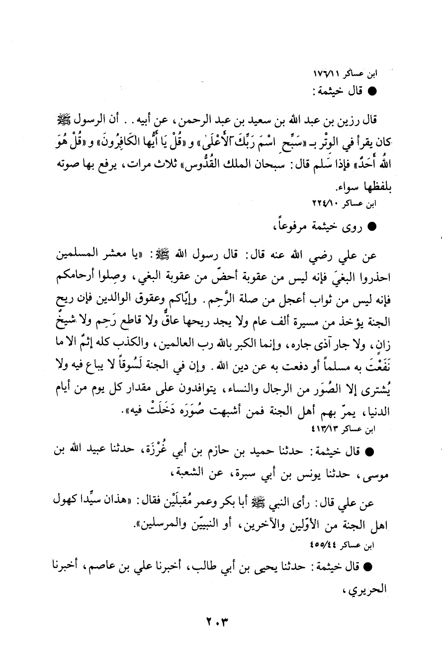 رَوَى خَيْثَمَةُ , مَرْفُوعًا , عَنْ عَلِيٍّ , رَضِيَ اللَّهُ عَنْهُ قَالَ: قَالَ رَسُولُ اللَّهِ صَلَّى اللهُ عَلَيْهِ وَسَلَّمَ: «§يَا مَعْشَرَ الْمُسْلِمِينَ , احْذَرُوا الْبَغْيَ؛ فَإِنَّهُ لَيْسَ مِنْ عُقُوبَةٍ أَحَضَّ مِنْ عُقُوبَةِ الْبَغْيِ , وَصِلُوا أَرْحَامَكُمْ؛ فَإِنَّهُ لَيْسَ مِنْ ثَوَابٍ أَعْجَلَ مِنْ صِلَةِ الرَّحِمِ , وَإِيَّاكُمْ وَعُقُوقَ الْوَالِدَيْنِ؛ فَإِنَّ رِيحَ الْجَنَّةِ يُؤْخَذُ مِنْ مَسِيرَةِ أَلْفِ عَامٍ , وَلَا يَجِدُ رِيحَهَا عَاقٌّ , وَلَا قَاطِعُ رَحِمٍ , وَلَا شَيْخٌ زَانٍ , وَلَا جَارٌ آذَى جَارَهُ , وَإِنَّمَا الْكِبْرُ بِاللَّهِ رَبِّ الْعَالَمِينَ , وَالْكَذِبُ كُلُّهُ إِثْمٌ , إِلَّا مَا نَفَعْتَ بِهِ مُسْلِمًا , أَوْ دَفَعْتَ بِهِ عَنْ دِينِ اللَّهِ , وَإِنَّ فِي الْجَنَّةِ لَسُوقًا , لَا يُبَاعُ فِيهِ وَلَا يُشْتَرَى إِلَّا الصُّوَرُ مِنَ الرِّجَالِ وَالنِّسَاءِ , يَتَوَافَدُونَ عَلَى مِقْدَارِ كُلِّ يَوْمٍ مِنْ أَيَّامِ الدُّنْيَا , يَمُرُّ بِهِمْ أَهْلُ الْجَنَّةِ فَمَنِ اشْتَهَى صُوَرَةً دَخَلَتْ فِيهِ»