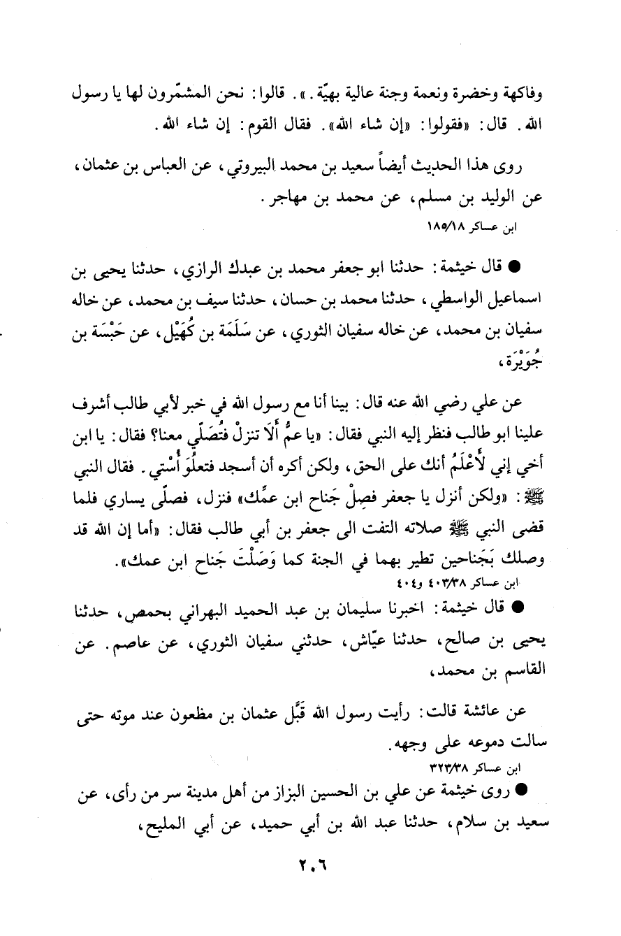 قال: خَيْثَمَةَ، حَدَّثَنَا أَبُو جَعْفَرٍ , مُحَمَّدُ بْنُ عَبْدَكَ الرَّازِيُّ , حَدَّثَنَا يَحْيَى بْنُ إِسْمَاعِيلَ الْوَاسِطِيُّ , حَدَّثَنَا مُحَمَّدُ بْنُ حَسَّانَ , حَدَّثَنَا سَيْفُ بْنُ مُحَمَّدٍ , عَنْ خَالِهِ سُفْيَانَ الثَّوْرِيِّ , عَنْ سَلَمَةَ بْنِ كُهَيْلٍ , عَنْ حَبْسَةَ بْنِ جُوَيْرَةَ , عَنْ عَلِيٍّ , رَضِيَ اللَّهُ عَنْهُ قَالَ: بَيْنَا أَنَا مَعَ رَسُولِ اللَّهِ فِي خَبَرٍ لِأَبِي طَالِبٍ , أَشْرَفَ عَلَيْنَا أَبُو طَالِبٍ , فَنَظَرَ إِلَيْهِ النَّبِيُّ فَقَالَ: " يَا عَمِّ , §أَلَا تَنْزِلُ فَتُصَلِّيَ مَعَنَا؟ فَقَالَ: يَا ابْنَ أَخِي , إِنِّي لَأَعْلَمُ أَنَّكَ عَلَى الْحَقِّ , وَلَكِنْ أَكْرَهُ أَنْ أَسْجُدَ فَتَعْلُوَ اسْتِي , فَقَالَ النَّبِيُّ صَلَّى اللهُ عَلَيْهِ وَسَلَّمَ: «وَلَكِنِ انْزِلْ يَا جَعْفَرُ فَصِلْ جَنَاحَ ابْنِ عَمِّكَ» , فَنَزَلَ فَصَلَّى يَسَارِي , فَلَمَّا قَضَى النَّبِيُّ صَلَّى اللهُ عَلَيْهِ وَسَلَّمَ صَلَاتَهُ الْتَفَتَ إِلَى جَعْفَرِ بْنِ أَبِي طَالِبٍ فَقَالَ: «أَمَا إِنَّ اللَّهَ قَدْ وَصَلَكَ بِجَنَاحَيْنِ تَطِيرُ بِهِمَا فِي الْجَنَّةِ , كَمَا وَصَلْتَ جَنَاحَ ابْنِ عَمِّكَ»
