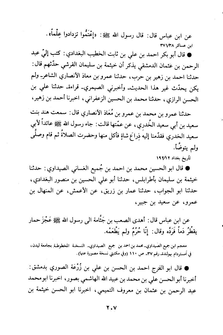 قَالَ أَبُو بَكْرٍ أَحْمَدُ بْنُ عَلِيِّ بْنِ ثَابِتٍ الْخَطِيبُ الْبَغْدَادِيُّ: كَتَبَ إِلَيَّ عَبْدُ الرَّحْمَنِ بْنُ عُثْمَانَ الدِّمَشْقِيُّ، يَذْكُرُ أَنَّ خَيْثَمَةَ بْنَ سُلَيْمَانَ الْقُرَشِيَّ حَدَّثَهُمْ قَالَ: حَدَّثَنَا أَحْمَدُ بْنُ زُهَيْرِ بْنِ حَرْبٍ , حَدَّثَنَا عَمْرُو بْنُ مُعَاذٍ الْأَنْصَارِيُّ الشَّاعِرُ , وَلَمْ يَكُنْ يُحَدِّثُ غَيْرَ هَذَا الْحَدِيثِ , وَأَخْبَرَنِي الصَّيْمَرِيُّ قِرَاءَةً , حَدَّثَنَا عَلِيُّ بْنُ الْحَسَنِ الرَّازِيُّ , حَدَّثَنَا مُحَمَّدُ بْنُ الْحُسَيْنِ الزَّعْفَرَانِيُّ , أَخْبَرَنَا أَحْمَدُ بْنُ زُهَيْرٍ , حَدَّثَنَا عَمْرُو بْنُ مُحَمَّدِ بْنِ عَمْرِو بْنِ مُعَاذٍ الْأَنْصَارِيُّ قَالَ: سَمِعْتُ هِنْدَ بِنْتَ سَعِيدِ بْنِ أَبِي سَعِيدٍ الْخُدْرِيِّ , عَنْ عَمَّتِهَا قَالَتْ: §جَاءَ رَسُولُ اللَّهِ صَلَّى اللهُ عَلَيْهِ وَسَلَّمَ عَائِدًا لِأَبِي سَعِيدٍ الْخُدْرِيِّ , فَقَدَّمْنَا إِلَيْهِ ذِرَاعَ شَاةٍ , فَأَكَلَ مِنْهَا , وَحَضَرَتِ الصَّلَاةُ ثُمَّ قَامَ وَصَلَّى وَلَمْ يَتَوَضَّأْ