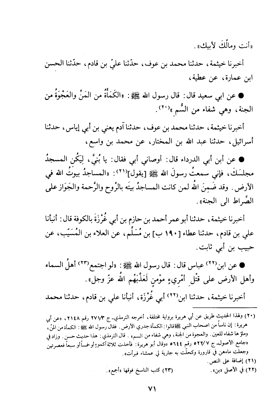 أَخْبَرَنَا خَيْثَمَةُ، حَدَّثَنَا مُحَمَّدُ بْنُ عَوْفٍ , حَدَّثَنَا عَلِيُّ بْنُ قَادِمٍ , حَدَّثَنَا الْحَسَنُ بْنُ عُمَارَةَ , عَنْ عَطِيَّةَ , عَنْ أَبِي سَعِيدٍ , قَالَ: قَالَ رَسُولُ اللَّهِ صَلَّى اللهُ عَلَيْهِ وَسَلَّمَ: «§الْكَمْأَةُ مِنَ الْمَنِّ , وَالْعَجْوَةُ مِنَ الْجَنَّةِ , وَهِيَ شِفَاءٌ مِنَ السُّمِّ»