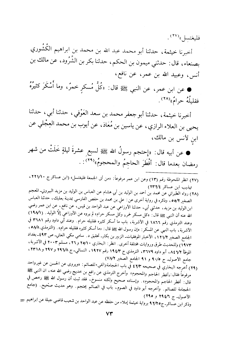 أَخْبَرَنَا خَيْثَمَةُ، حَدَّثَنَا أَبُو مُحَمَّدٍ عَبْدُ اللَّهِ بْنُ مُحَمَّدِ بْنِ إِبْرَاهِيمَ الْكَشْوَرِيُّ , بِصَنْعَاءَ قَالَ: حَدَّثَنِي مَيْمُونُ بْنُ الْحَكَمِ , حَدَّثَنَا بَكْرُ بْنُ الشَّرُودِ , عَنْ مَالِكِ بْنِ أَنَسٍ , وَعُبَيْدِ اللَّهِ بْنِ عُمَرَ , عَنْ نَافِعٍ , عَنِ ابْنِ عُمَرَ , عَنِ النَّبِيِّ صَلَّى اللهُ عَلَيْهِ وَسَلَّمَ قَالَ: «§كُلُّ مُسْكِرٍ خَمْرٌ , وَمَا أَسْكَرَ كَثِيرُهُ فَقَلِيلُهُ حَرَامٌ»