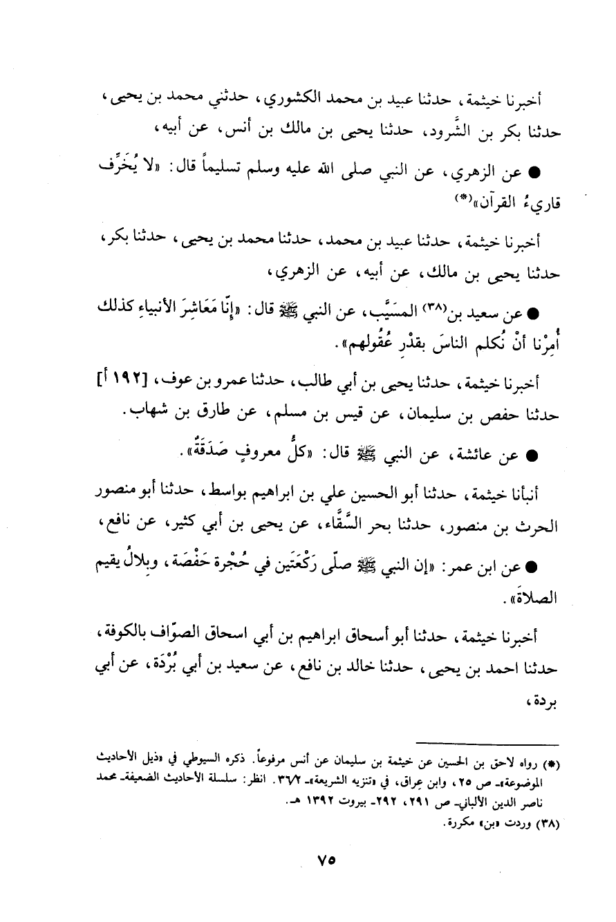 أَخْبَرَنَا خَيْثَمَةُ، حَدَّثَنَا عُبَيْدُ بْنُ مُحَمَّدٍ الْكَشْوَرِيُّ , حَدَّثَنِي مُحَمَّدُ بْنُ يَحْيَى , حَدَّثَنَا بَكْرُ بْنُ الشَّرُودِ , حَدَّثَنَا يَحْيَى بْنُ مَالِكِ بْنِ أَنَسٍ , عَنْ أَبِيهِ , عَنِ الزُّهْرِيِّ , عَنِ النَّبِيِّ صَلَّى اللهُ عَلَيْهِ وَسَلَّمَ تَسْلِيمًا قَالَ: «§لَا يُخَرِّفُ قَارِئُ الْقُرْآنِ»