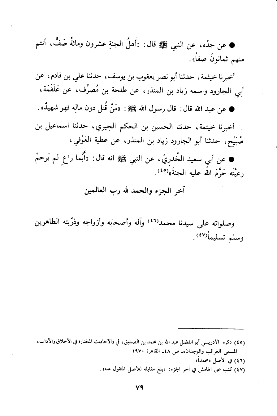 أَخْبَرَنَا خَيْثَمَةُ، حَدَّثَنَا الْحُسَيْنُ بْنُ الْحَكَمِ الْحِيرِيُّ , حَدَّثَنَا إِسْمَاعِيلُ بْنُ صُبَيْحٍ , حَدَّثَنَا أَبُو الْجَارُودِ زِيَادُ بْنُ الْمُنْذِرِ , عَنْ عَطِيَّةَ الْعَوْفِيِّ , عَنْ أَبِي سَعِيدٍ الْخُدْرِيِّ , عَنِ النَّبِيِّ صَلَّى اللهُ عَلَيْهِ وَسَلَّمَ أَنَّهُ قَالَ: «§أَيُّمَا رَاعٍ لَمْ يَرْحَمْ رَعِيَّتَهُ حَرَّمَ اللَّهُ عَلَيْهِ الْجَنَّةَ»