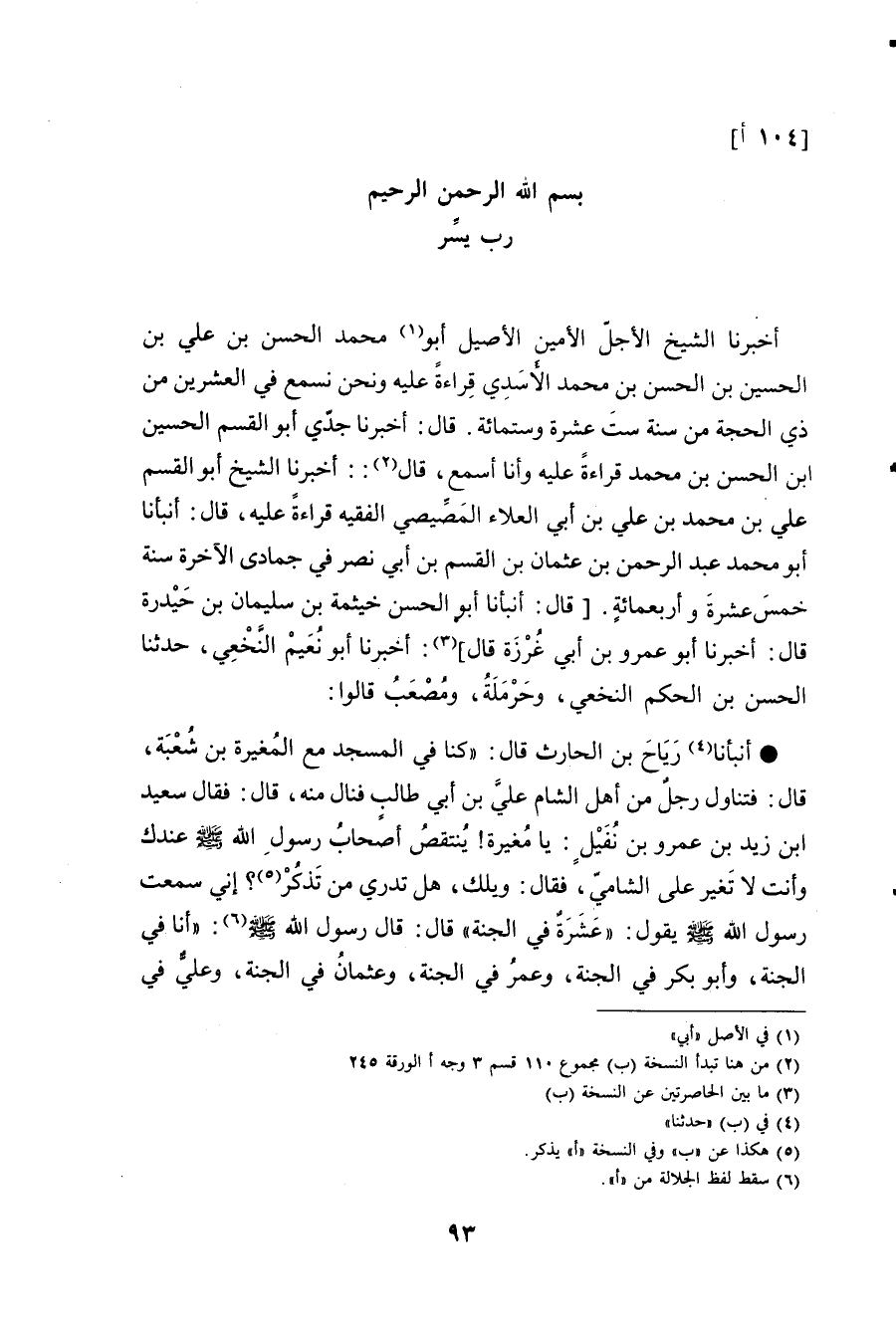 أَخْبَرَنَا الشَّيْخُ الْأَجَلُّ الْأَمِينُ الْأَصِيلُ أَبُو مُحَمَّدٍ الْحَسَنُ بْنُ عَلِيِّ بْنِ الْحُسَيْنِ بْنِ الْحَسنِ بْنِ مُحَمَّدٍ الْأَسَدِيُّ قِرَاءَةً عَلَيْهِ وَنَحْنُ نَسْمَعُ فِي الْعِشْرِينَ مِنْ ذِي الْحِجَّةِ مِنْ سَنَةِ سَتَّ عَشْرَةَ وَسِتِّمِائَةٍ. قَالَ: أَخْبَرَنَا جَدِّي أَبُو الْقَاسِمِ الْحُسَيْنُ بْنُ الْحَسَنِ بْنِ مُحَمَّدٍ قِرَاءَةً عَلَيْهِ وَأَنَا أَسْمَعُ، قَالَ: أَخْبَرَنَا الشَّيْخُ أَبُو الْقَاسِمِ عَلِيُّ بْنُ مُحَمَّدِ بْنِ عَلِيِّ بْنِ أَبِي الْعَلَاءِ الْمِصِّيصِيُّ الْفَقِيهُ قِرَاءَةً عَلَيْهِ، قَالَ: أَنْبَأَنَا أَبُو مُحَمَّدٍ عَبْدُ الرَّحْمَنِ بْنُ عُثْمَانَ بْنِ الْقَاسِمِ بْنِ أَبِي نَصْرٍ فِي جُمَادَى الْآخِرَةِ سَنَةَ خَمْسَ عَشْرَةَ وَأَرْبَعِمِائَةٍ. قَالَ: أَنْبَأَنَا أَبُو الْحَسِن خَيْثَمَةُ بْنُ سُلَيْمَانَ بْنِ حَيْدَرَةَ قَالَ: أَخْبَرَنَا أَبُو عَمْرِو بْنُ أَبِي غَرْزَةَ قَالَ: أَخْبَرَنَا أَبُو نُعَيْمٍ النَّخَعِيُّ، حَدَّثَنَا الْحَسَنُ بْنُ الْحَكَمِ النَّخَعِيُّ، وَحَرْمَلَةُ، وَمُصْعَبٌ قَالُوا: أَنْبَأَنَا رِيَاحُ بْنُ الْحَارِثِ , قَالَ: كُنَّا فِي الْمَسْجِدِ مَعَ الْمُغِيرَةِ بْنِ شُعْبَةَ , قَالَ: فَتَنَاوَلَ رَجُلٌ مِنْ أَهْلِ الشَّامِ عَلِيَّ بْنَ أَبِي طَالِبٍ فَنَالَ مِنْهُ , قَالَ: فَقَالَ سَعِيدُ بْنُ زَيْدِ بْنِ عَمْرِو بْنِ نُفَيْلٍ: يَا مُغِيرَةُ , يُنْتَقَصُ أَصْحَابُ رَسُولِ اللَّهِ صَلَّى اللهُ عَلَيْهِ وَسَلَّمَ عِنْدَكَ وَأَنْتَ لَا تُغَيِّرُ عَلَى الشَّامِيِّ؟ فَقَالَ: وَيْلَكَ هَلْ تَدْرِي مَنْ تَذْكُرُ؟ إِنِّي سَمِعْتُ رَسُولَ اللَّهِ صَلَّى اللهُ عَلَيْهِ وَسَلَّمَ يَقُولُ: «عَشَرَةٌ فِي الْجَنَّةِ» , قَالَ: قَالَ رَسُولُ اللَّهِ صَلَّى اللهُ عَلَيْهِ وَسَلَّمَ: «§أَنَا فِي الْجَنَّةِ , وَأَبُو بَكْرٍ فِي الْجَنَّةِ , وَعُمَرُ فِي الْجَنَّةِ , وَعُثْمَانُ فِي الْجَنَّةِ , وَعَلِيٌّ فِي -[94]- الْجَنَّةِ , وَطَلْحَةُ فِي الْجَنَّةِ , وَالزُّبَيْرُ فِي الْجَنَّةِ , وَعَبْدُ الرَّحْمَنِ بْنُ عَوْفٍ فِي الْجَنَّةِ , وَسَعْدٌ فِي الْجَنَّةِ» , قَالَ: فَقَالَ رِيَاحُ بْنُ حَارِثٍ: فَقُلْنَا لَهُ: مَنِ الْعَاشِرُ؟ فَقَالَ: اللَّهُمَّ أَنَا , وَقَالَ رَسُولُ اللَّهِ صَلَّى اللهُ عَلَيْهِ وَسَلَّمَ: «سَعِيدُ بْنُ زَيْدٍ فِي الْجَنَّةِ» , رَضِيَ اللَّهُ عَنْهُمْ