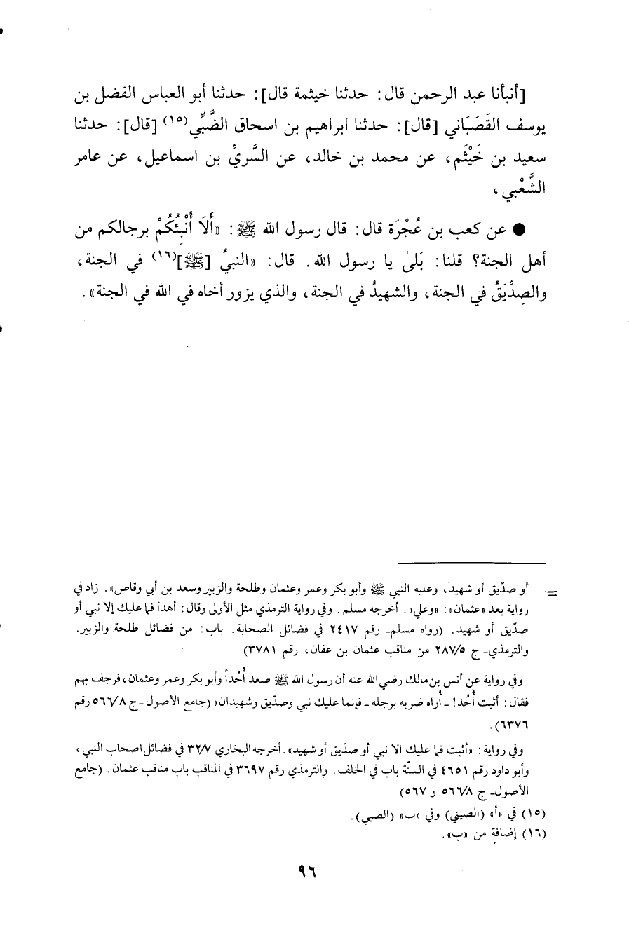 أَنْبَأَنَا عَبْدُ الرَّحْمَنِ , قَالَ: حَدَّثَنَا خَيْثَمَةُ , قَالَ: حَدَّثَنَا أَبُو الْعَبَّاسِ الْفَضْلُ بْنُ يُوسُفَ الْقَصَبَانِيُّ , قَالَ: حَدَّثَنَا إِبْرَاهِيمُ بْنُ إِسْحَاقَ الضَّبِّيُّ , قَالَ: حَدَّثَنَا سَعِيدُ بْنُ خُثَيْمٍ , عَنْ مُحَمَّدِ بْنِ خَالِدٍ , عَنِ السَّرِيِّ بْنِ إِسْمَاعِيلَ , عَنْ عَامِرٍ الشَّعْبِيِّ , عَنْ كَعْبِ بْنِ عُجْرَةَ , قَالَ: قَالَ رَسُولُ اللَّهِ صَلَّى اللهُ عَلَيْهِ وَسَلَّمَ: «§أَلَا أُنَبِّئُكُمْ بِرِجَالِكُمْ مِنْ أَهْلِ الْجَنَّةِ؟» قُلْنَا: بَلَى يَا رَسُولَ اللَّهِ , قَالَ: النَّبِيُّ صَلَّى اللهُ عَلَيْهِ وَسَلَّمَ فِي الْجَنَّةِ , وَالصِّدِّيقُ فِي الْجَنَّةِ , وَالشَّهِيدُ فِي الْجَنَّةِ , وَالَّذِي يَزُورُ أَخَاهُ فِي اللَّهِ فِي الْجَنَّةِ "