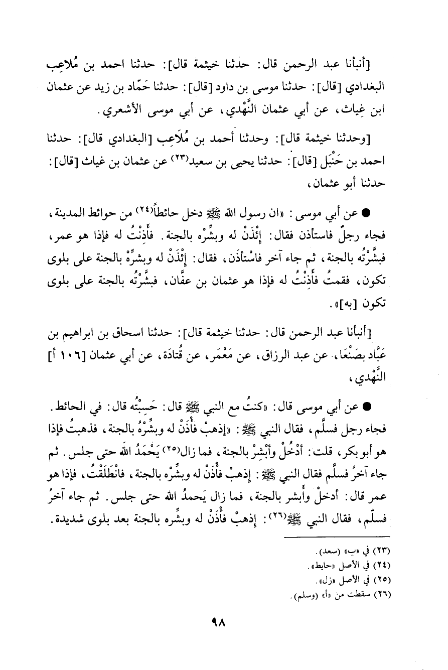 أَنْبَأَنَا عَبْدُ الرَّحْمَنِ قَالَ: حَدَّثَنَا خَيْثَمَةُ , قَالَ: حَدَّثَنَا أَحْمَدُ بْنُ مُلَاعِبٍ الْبَغْدَادِيُّ , قَالَ: حَدَّثَنَا مُوسَى بْنُ دَاوُدَ , قَالَ: حَدَّثَنَا حَمَّادُ بْنُ زَيْدٍ , عَنْ عُثْمَانَ بْنِ غِيَاثٍ , عَنْ أَبِي عُثْمَانَ النَّهْدِيِّ , عَنْ أَبِي مُوسَى الْأَشْعَرِيِّ , وَحَدَّثَنَا خَيْثَمَةُ , قَالَ: وَحَدَّثَنَا أَحْمَدُ بْنُ مُلَاعِبٍ الْبَغْدَادِيُّ , قَالَ: حَدَّثَنَا أَحْمَدُ بْنُ حَنْبَلٍ , قَالَ: حَدَّثَنَا يَحْيَى بْنُ سَعِيدٍ , عَنْ عُثْمَانَ بْنِ غِيَاثٍ , قَالَ: حَدَّثَنَا أَبُو عُثْمَانَ , عَنْ أَبِي مُوسَى , أَنَّ رَسُولَ اللَّهِ صَلَّى اللهُ عَلَيْهِ وَسَلَّمَ دَخَلَ حَائِطًا مِنْ حَوَائِطِ الْمَدِينَةِ , فَجَاءَ رَجُلٌ فَاسْتَأْذَنَ , فَقَالَ: «§ائْذَنْ لَهُ وَبَشِّرْهُ بِالْجَنَّةِ» , فَأَذِنْتُ لَهُ , فَإِذَا هُوَ عُمَرُ , فَبَشَّرْتُهُ بِالْجَنَّةِ , ثُمَّ جَاءَ آخَرُ فَاسْتَأْذَنَ , فَقَالَ: «ائْذَنْ لَهُ وَبَشِّرْهُ بِالْجَنَّةِ عَلَى بَلْوَى تَكُونُ» , فَقُمْتُ فَأَذِنْتُ لَهُ , فَإِذَا هُوَ عُثْمَانُ بْنُ عَفَّانَ , فَبَشَّرْتُهُ بِالْجَنَّةِ عَلَى بَلْوَى تَكُونُ بِهِ