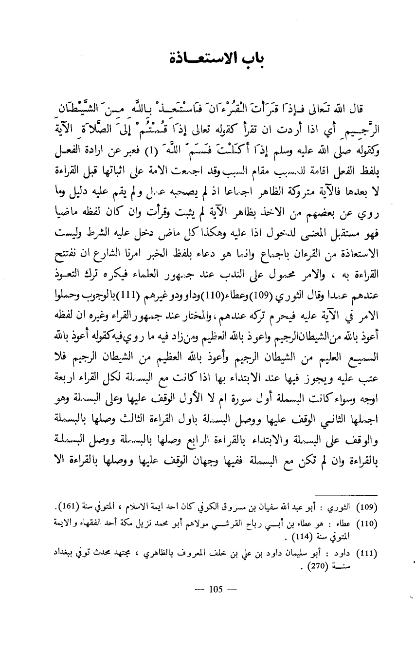 قال الله تَعالى فإذَا قَرَأتَ الْقُرْءانَ فأَستعِذْ بِاللهِ مِنَ الشَّيْطَانِ الرَّجِيِم أي إذا أردت إن تقرأ كقوله تعالى إذا قُمْتُمْ إلىَ الصَلاَة الآية كقوله صلى الله عليه وسلم إذا أكَلْتَ فسمّ الله فعبر عن إرادة الفعل بلفظ الفعل إقامة للمسبب مقام السبب وقد أجمعت الأمة على إثباتها قبل القراءة لا بعدها فالآية متروكة الظاهر إجماعا إذ لم يصحبه عمل ولم يقم عليه دليل وما روي عن بعضهم من الأخذ بظاهر الآية لم يثبت وقرأت وان كان لفظه ماضيا فهَو مستقبل المعنى لدخول إذا عليه وهكذا كل ماض دخل عليه الشرط وليست الاستعاذة من القرآن بإجماع وإنما هو دعاء بلفظ الخبر أمرنا الشارع إن نفتتح القراءة به، والأمر محمول على الندب عند جمهور العلماء فيكره ترك التعوذ عندهم عمدا وقال الثوري وعطاء وداوود وغيرهم بالوجوب وحملوا الأمر في الآية عليه فيحرم تركه عندهم، والمختار عند جمهور القراء وغيره إن لفظه أعوذ بالله من الشيطان الرجيم وأعوذ بالله العظيم ومن زاد فيه ما روي فيه كقوله أعوذ بالله السميع العليم من الشيطان الرجيم وأعوذ بالله العظيم من الشيطان الرجيم فلا عتب عليه ويجوز فيها عند الابتداء بها إذا كانت مع البسملة لكل القراء أربعة اوجه وسواء كانت البسملة أول سورة أم لا الأول الوقف عليها وعلى البسملة وهو أجملها الثاني الوقف عليها ووصل البسملة بأول القراءة الثالث وصلها بالبسملة والوقف على البسملة والابتداء بالقراءة الرابع وصلها بالبسملة ووصل البسملة بالقراءة وان لم تكن مع البسملة ففيها وجهان الوقع عليها ووصلها بالقراءة إلا