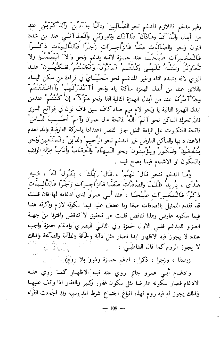 وأما المدغم فنحو قاَلَ لهُم، قال رَبُّكَ، يَقُولُ لَهُ، فيه هُدىً، يُريدُ ظُلْماً والصّافَّاتِ صَفّاً فَالزَّاجِرَاتِ زَجْرْاً فَالتَّالِيَاتِ ذِكْراً فالْمُغيرات صُبْحاً، عند أبي عمروَ لدى إدغامه لها فان قلت قد تقدم التمثيل بالصافات صفا وما عطف عليه فيما سكونه لازم وذكرته هنا فيما سكونه عارض وهذا تناقض قلت هو تحقيق لا تناقض وافترقا من جهة العزو للمدغم ففي الأول لحمزة وفي الثاني للبصري وإدغام حمزة واجب عنده لا يجوز فيه الإظهار ابدأ فصار مثل دآبة والحاقة والطامة والصاخة ولذلك لا يجوز الروم كما قال الشاطبي: " وصفا، وزجرا، ذكرا، ادغم حمزة وذووا بلا روم ".