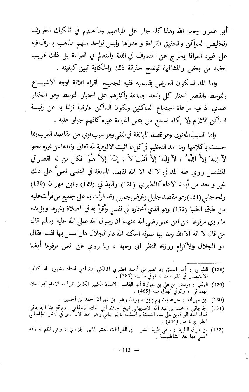 أبو عمرو رحمه الله وهذا كله جار على طباعهم ومذهبهم في تفكيك الحروف وتخليص السواكن وتحقق القراءة وحدرها وليس لواحد منهم مذهب يسرف فيه على غيره اسرافا يخرج عن المتعارف في اللغة والمتعالم في القراءة بل ذلك قريب بعضه من بعض والمشافهة توضح حقيقة ذلك والحكاية تبين كيفيته.