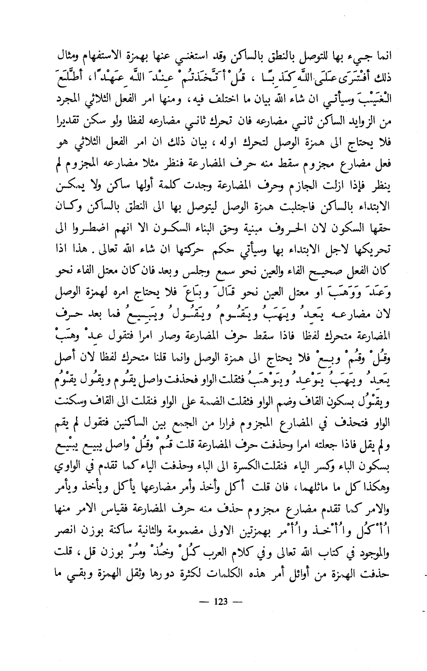 إنما جيء بها للتوصل بالنطق بالساكن وَقد استغني عنها بهمزة الاستفهام وَمثال ذلك أفْتَرَى على اللهِ كَذِباً، قُلْ أتَّخَذتُمْ عَنْدَ اللهِ عَهْداً، أطَّلَعَ الغيب وَسيأتي إن شاء الله بيان ما اختلف فيه، ومنها أمر الفعل الثلاثي المجرد من الزوايد الساكن ثاني مضارعِه فان تحرك ثاني مضارعه لفظا ولو سكن تقديرا فلا يحتاج إلى همزة الوصل لتحرك أوله، بيان ذلك أن أمر الفعل الثلاثي هو فعل مضارع مجزوم سقط منه حرف المضارعة فنظر مثلا مضارعِه المجزوَم لم ينظر فإذا أزلت الجازم وحرف المضارعِة وجدت كلمة أوَلها ساكن وَلا يمكن الابتداء بالساكن فاجتلبت همزة الوصل ليتوصل بها إلى النطق بالساكن وَكان حقها السكون لان الحروف مبنية وحق البناء السكون إلا انهم اضطروا إلى تحريكها لأجل الابِتداء بها وسيأتي حكم حركتها إن شاء الله تعالى. هذا إذا كان الفعل صحيح الفاء والعين نحو سمع وجلس وبعد فان كان معتل الفاء نحو وَعَدَ ووَهَبَ أو معتل العين نحو قاَلَ وباَعَ فلا يحتاج أمره لهمزة الوَصل لان مضارعه يَعِدُ ويَهَبُ ويَقُومُ ويَقولُ ويبيعُ فما بعد حرف المضارعة متحرك لفظا فإذا سقط حرف المضارعة وصار أمرا فتقول عِدْ وَهَبْ وقُلْ وَقمْ وبِعْ فلا يحتاج إلى همزة الوصل وإنما قلنا متحرك لفظا لان أصل يَعِدُ ويَهَبُ يَوْعِدُ ويَوْهَبُ فثقلت الواو وحذفت واصل يقُوم وَيقول يقْوُم ويقوُل بسكوَن القاف وضم الواو فقلت الضمة على الواو فنقلت إلى القاف وسكنت الواوَ فتحذف في المضارع المجزوَم فرارا من الجمع بين الساكنين فتقول لم يقم ولم يقل فإذا جعلته أمرا وحذفت حرف المضارعة قلت قُمْ وقلْ وَاصل يبيع يبْيع بسكون الياء وكسر الياء فنقلت الكسرة إلى الياء وحذفت الياء كما تقدم في الواوي وهكذا كل ما ماثلهما، فإن قلت أكل وأخذ وأمر مضارع مما يأكل ويأخذ ويأمر والامر كما تقدم مضارع مجزوم حذف منه حرف المضارعة فقياس الامر منها اُ أكل واُ أخذواُ أْمر بهمزتين الاولى مضمومة والثانية ساكنة بوزن انصر والموجود في كتاب الله تعالى وفي كلام العرب كُل وخُذْ ومُرْ بوزن قل، قلت حذفت الهمزة من أوائل أمر هذه الكلمات لكثرة دورها وثقل الهمزة وبقي ما