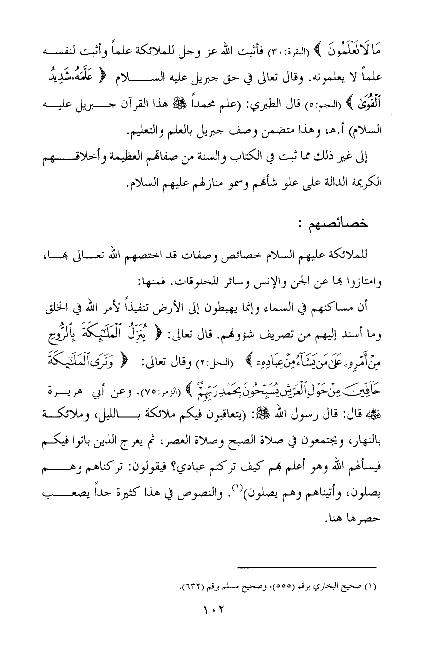 أن مساكنهم في السماء وإنما يهبطون إلى الأرض تنفيذًا لأمر الله في الخلق وما أسند إليهم من تصريف شؤونهم. قال تعالى: {يُنَزِّلُ الْمَلَائِكَةَ بِالرُّوحِ مِنْ أَمْرِهِ عَلَى مَنْ يَشَاءُ مِنْ عِبَادِهِ} [النحل: 2] (النحل: 2) وقال تعالى: {وَتَرَى الْمَلَائِكَةَ حَافِّينَ مِنْ حَوْلِ الْعَرْشِ يُسَبِّحُونَ بِحَمْدِ رَبِّهِمْ} [الزمر: 75] (الزمر: 75) . وعن أبي هريرة رضي الله عنه قال: قال رسول الله صلى الله عليه وسلم: «يتعاقبون فيكم ملائكة بالليل، وملائكة بالنهار، ويجتمعون في صلاة الصبح وصلاة العصر، ثم يعرج الذين باتوا فيكم فيسألهم الله وهو أعلم بهم كيف تركتم عبادي؟ فيقولون: تركناهم وهم يصلون، وأتيناهم وهم يصلون» (¬1) . والنصوص في هذا كثيرة جدًّا يصعب حصرها هنا.