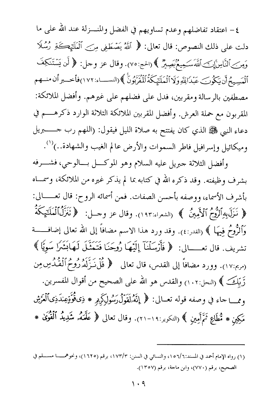4 - اعتقاد تفاضلهم وعدم تساويهم في الفضل والمنزلة عند الله على ما دلت على ذلك النصوص: قال تعالى: {اللَّهُ يَصْطَفِي مِنَ الْمَلَائِكَةِ رُسُلًا وَمِنَ النَّاسِ إِنَّ اللَّهَ سَمِيعٌ بَصِيرٌ} [الحج: 75] (الحج: 75) . وقال عز وجل: {لَنْ يَسْتَنْكِفَ الْمَسِيحُ أَنْ يَكُونَ عَبْدًا لِلَّهِ وَلَا الْمَلَائِكَةُ الْمُقَرَّبُونَ} [النساء: 172] (النساء: 172) فأخبر أن منهم مصطفين بالرسالة ومقربين، فدل على فضلهم على غيرهم. وأفضل الملائكة: المقربون مع حملة العرش. وأفضل المقربين الملائكة الثلاثة الوارد ذكرهم في دعاء النبي صلى الله عليه وسلم الذي كان يفتتح به صلاة الليل فيقول: «اللهم رب جبريل وميكائيل وإسرافيل فاطر السماوات والأرض عالم الغيب والشهادة» . .) (¬1) .