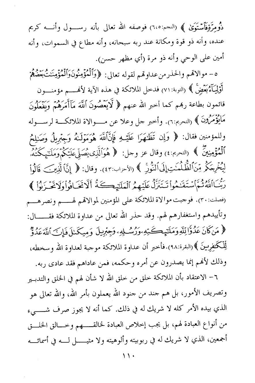 5 - موالاتهم والحذر من عداوتهم لقوله تعالى: {وَالْمُؤْمِنُونَ وَالْمُؤْمِنَاتُ بَعْضُهُمْ أَوْلِيَاءُ بَعْضٍ} [التوبة: 71] (التوبة: 71) فدخل الملائكة في هذه الآية لأنهم مؤمنون قائمون بطاعة ربهم كما أخبر الله عنهم {لَا يَعْصُونَ اللَّهَ مَا أَمَرَهُمْ وَيَفْعَلُونَ مَا يُؤْمَرُونَ} [التحريم: 6] (التحريم: 6) . وأخبر جل وعلا عن موالاة الملائكة لرسوله وللمؤمنين فقال: {وَإِنْ تَظَاهَرَا عَلَيْهِ فَإِنَّ اللَّهَ هُوَ مَوْلَاهُ وَجِبْرِيلُ وَصَالِحُ الْمُؤْمِنِينَ} [التحريم: 4] (التحريمَ: 4) وقال عز وجل: {هُوَ الَّذِي يُصَلِّي عَلَيْكُمْ وَمَلَائِكَتُهُ لِيُخْرِجَكُمْ مِنَ الظُّلُمَاتِ إِلَى النُّورِ} [الأحزاب: 43] (الأحزاب: 43) . وقال: {إِنَّ الَّذِينَ قَالُوا رَبُّنَا اللَّهُ ثُمَّ اسْتَقَامُوا تَتَنَزَّلُ عَلَيْهِمُ الْمَلَائِكَةُ أَلَّا تَخَافُوا وَلَا تَحْزَنُوا} [فصلت: 30] (فصلتَ: 30) . فوجبت موالاة الملائكة على المؤمنين لموالاتهم لهم ونصرهم وتأييدهم واستغفارهم لهم. وقد حذر الله تعالى من عداوة الملائكة فقال: {مَنْ كَانَ عَدُوًّا لِلَّهِ وَمَلَائِكَتِهِ وَرُسُلِهِ وَجِبْرِيلَ وَمِيكَالَ فَإِنَّ اللَّهَ عَدُوٌّ لِلْكَافِرِينَ} [البقرة: 98] (البقرة: 98) . فأخبر أن عداوة الملائكة موجبة لعداوة الله وسخطه، وذلك لأنهم إنما يصدرون عن أمره وحكمه، فمن عاداهم فقد عادى ربه.