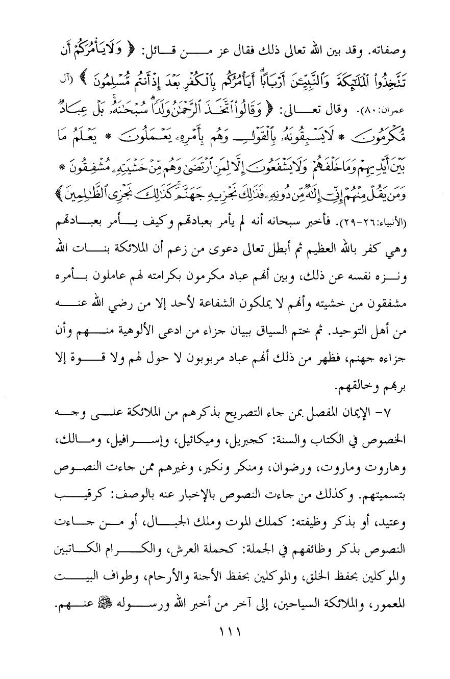 وصفاته. وقد بين الله تعالى ذلك فقال عز من قائل: {وَلَا يَأْمُرَكُمْ أَنْ تَتَّخِذُوا الْمَلَائِكَةَ وَالنَّبِيِّينَ أَرْبَابًا أَيَأْمُرُكُمْ بِالْكُفْرِ بَعْدَ إِذْ أَنْتُمْ مُسْلِمُونَ} [آل عمران: 80] (آل عمران: 80) . وقال تعالى: {وَقَالُوا اتَّخَذَ الرَّحْمَنُ وَلَدًا سُبْحَانَهُ بَلْ عِبَادٌ مُكْرَمُونَ - لَا يَسْبِقُونَهُ بِالْقَوْلِ وَهُمْ بِأَمْرِهِ يَعْمَلُونَ - يَعْلَمُ مَا بَيْنَ أَيْدِيهِمْ وَمَا خَلْفَهُمْ وَلَا يَشْفَعُونَ إِلَّا لِمَنِ ارْتَضَى وَهُمْ مِنْ خَشْيَتِهِ مُشْفِقُونَ - وَمَنْ يَقُلْ مِنْهُمْ إِنِّي إِلَهٌ مِنْ دُونِهِ فَذَلِكَ نَجْزِيهِ جَهَنَّمَ كَذَلِكَ نَجْزِي الظَّالِمِينَ} [الأنبياء: 26 - 29] (الأنبياء: 26-29) . فأخبر سبحانه أنه لم يأمر بعبادتهم وكيف يأمر بعبادتهم وهي كفر بالله العظيم ثم أبطل تعالى دعوى من زعم أن الملائكة بنات الله ونزه نفسه عن ذلك، وبين أنهم عباد مكرمون بكرامته لهم عاملون بأمره مشفقون من خشيته وأنهم لا يملكون الشفاعة لأحد إلا من رضي الله عنه من أهل التوحيد. ثم ختم السياق ببيان جزاء من ادعى الألوهية منهم وأن جزاءه جهنم، فظهر من ذلك أهم عباد مربوبون لا حول لهم ولا قوة إلا بربهم وخالقهم.