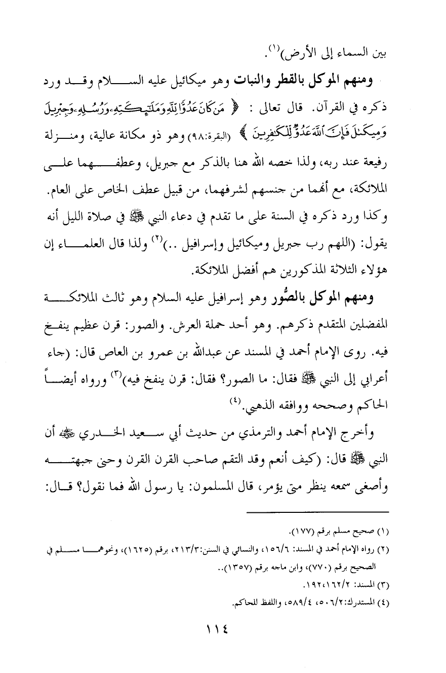 ومنهم الموكل بالصُّور وهو إسرافيل عليه السلام وهو ثالث الملائكة المفضلين المتقدم ذكرهم. وهو أحد حملة العرش. والصور: قرن عظيم ينفخ فيه. روى الإمام أحمد في المسند عن عبد الله بن عمرو بن العاص قال: «جاء أعرابي إلى النبي صلى الله عليه وسلم فقال: ما الصور؟ فقال: قرن ينفخ فيه» (¬3) ورواه أيضا الحاكم وصححه ووافقه الذهبي. (¬4) .
