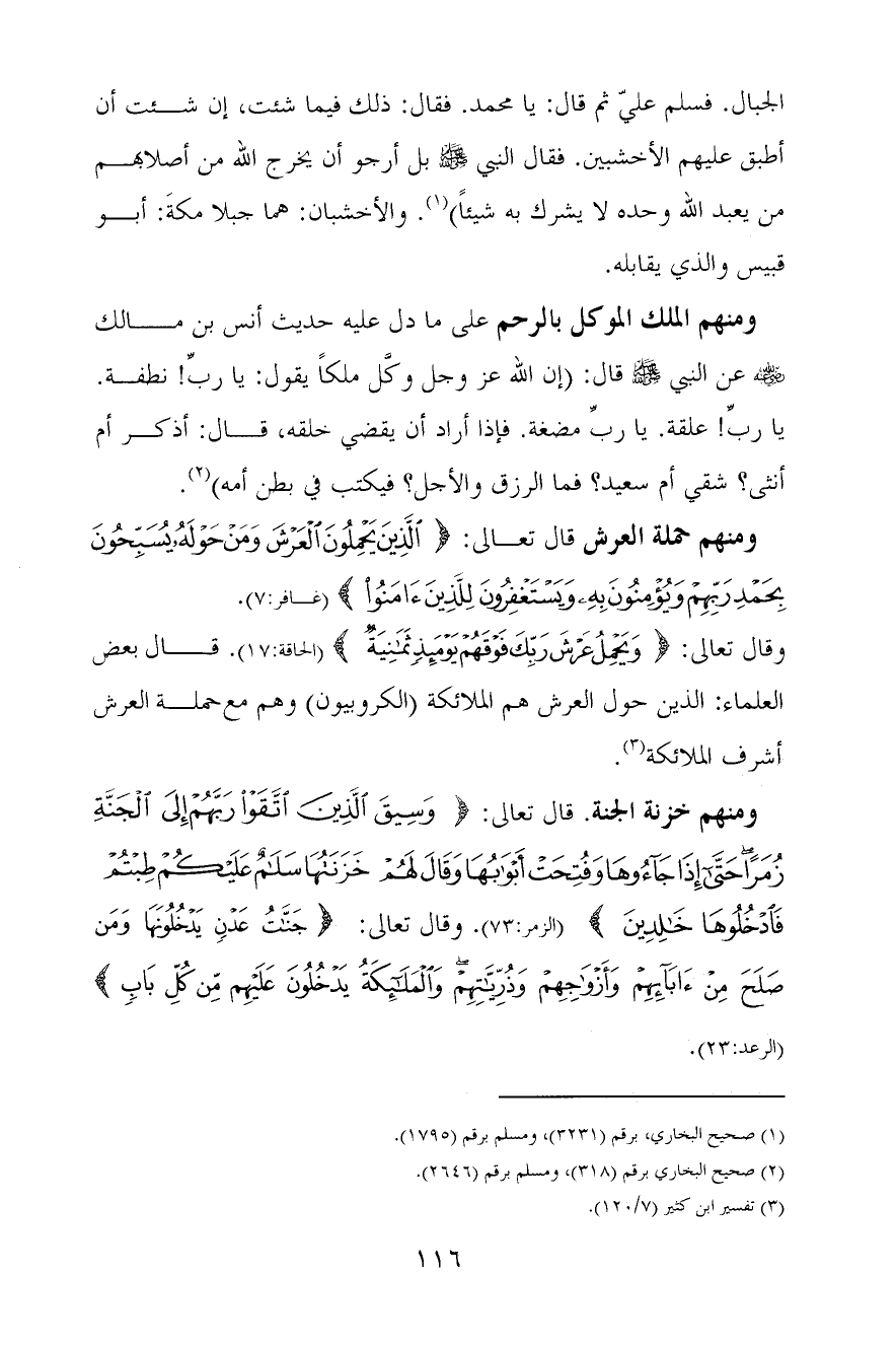 ومنهم خزنة الجنة. قال تعالى: {وَسِيقَ الَّذِينَ اتَّقَوْا رَبَّهُمْ إِلَى الْجَنَّةِ زُمَرًا حَتَّى إِذَا جَاءُوهَا وَفُتِحَتْ أَبْوَابُهَا وَقَالَ لَهُمْ خَزَنَتُهَا سَلَامٌ عَلَيْكُمْ طِبْتُمْ فَادْخُلُوهَا خَالِدِينَ} [الزمر: 73] (الزمر: 73) . وقال تعالى: {جَنَّاتُ عَدْنٍ يَدْخُلُونَهَا وَمَنْ صَلَحَ مِنْ آبَائِهِمْ وَأَزْوَاجِهِمْ وَذُرِّيَّاتِهِمْ وَالْمَلَائِكَةُ يَدْخُلُونَ عَلَيْهِمْ مِنْ كُلِّ بَابٍ} [الرعد: 23] (الرعد: 23) .
