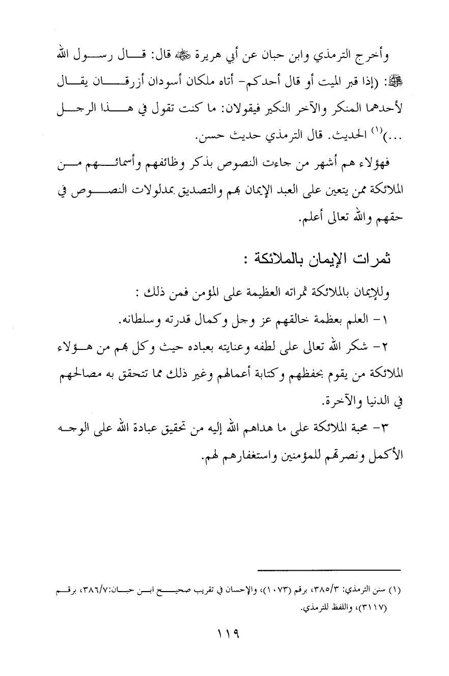 وأخرج الترمذي وابن حبان عن أبي هريرة رضي الله عنه قال: قال رسول الله صلى الله عليه وسلم: «إذا قبر الميت أو قال أحدكم- أتاه ملكان أسودان أزرقان يقال لأحدهما المنكر والآخر النكير فيقولان: ما كنت تقول في هذا الرجل» . . .) (¬1) الحديث. قال الترمذي حديث حسن.