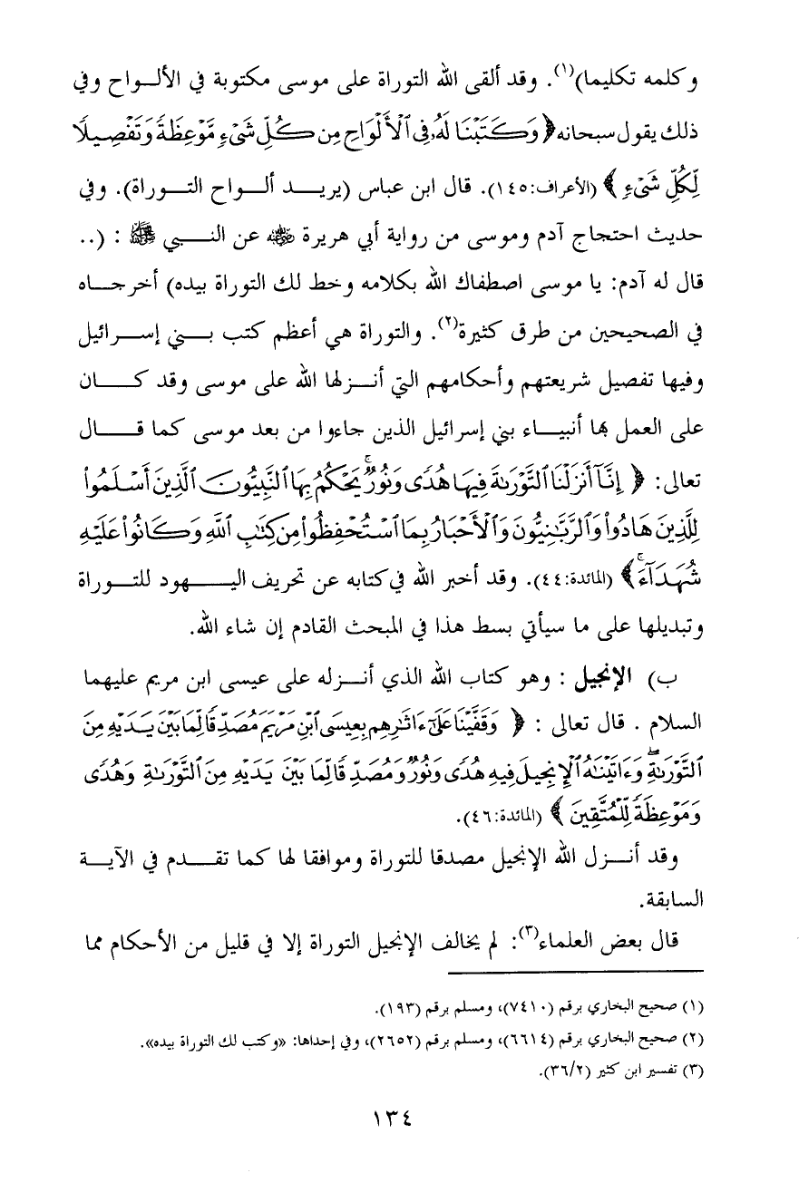 وكلمه تكليما» (¬1) وقد ألقى الله التوراة على موسى مكتوبة في الألواح وفي ذلك يقول سبحانه {وَكَتَبْنَا لَهُ فِي الْأَلْوَاحِ مِنْ كُلِّ شَيْءٍ مَوْعِظَةً وَتَفْصِيلًا لِكُلِّ شَيْءٍ} [الأعراف: 145] (الأعراف: 145) . قال ابن عباس (يريد ألواح التوراة) . وفي حديث احتجاج آدم وموسى من رواية أبي هريرة رضي الله عنه عن النبي: (. . . «قال له آدم: يا موسى اصطفاك الله بكلامه وخط لك التوراة بيده» أخرجاه في الصحيحين من طرق كثيرة (¬2) . والتوراة هي أعظم كتب بني إسرائيل وفيها تفصيل شريعتهم وأحكامهم التي أنزلها الله على موسى وقد كان على العمل بها أنبياء بني إسرائيل الذين جاءوا من بعد موسى كما قال تعالى: {إِنَّا أَنْزَلْنَا التَّوْرَاةَ فِيهَا هُدًى وَنُورٌ يَحْكُمُ بِهَا النَّبِيُّونَ الَّذِينَ أَسْلَمُوا لِلَّذِينَ هَادُوا وَالرَّبَّانِيُّونَ وَالْأَحْبَارُ بِمَا اسْتُحْفِظُوا مِنْ كِتَابِ اللَّهِ وَكَانُوا عَلَيْهِ شُهَدَاءَ} [المائدة: 44] (المائدة: 44) . وقد أخبر الله في كتابه عن تحريف اليهود للتوراة وتبديلها على ما سيأتي بسط هذا في المبحث القادم إن شاء الله.
