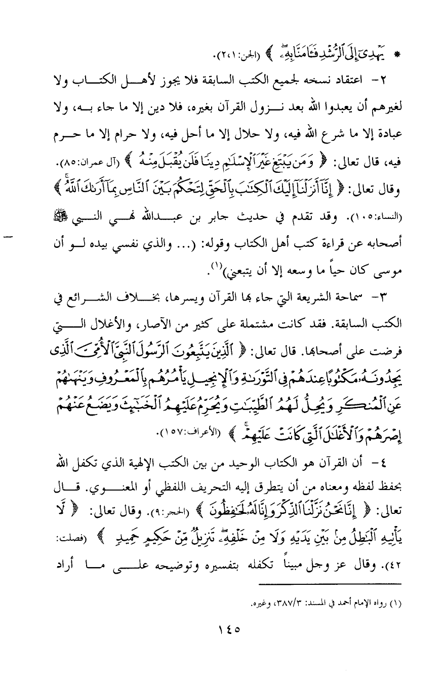 3 - سماحة الشريعة التي جاء بها القرآن ويسرها، بخلاف الشرائع في الكتب السابقة. فقد كانت مشتملة على كثير من الآصار، والأغلال التي فرضت على أصحابها. قال تعالى: {الَّذِينَ يَتَّبِعُونَ الرَّسُولَ النَّبِيَّ الْأُمِّيَّ الَّذِي يَجِدُونَهُ مَكْتُوبًا عِنْدَهُمْ فِي التَّوْرَاةِ وَالْإِنْجِيلِ يَأْمُرُهُمْ بِالْمَعْرُوفِ وَيَنْهَاهُمْ عَنِ الْمُنْكَرِ وَيُحِلُّ لَهُمُ الطَّيِّبَاتِ وَيُحَرِّمُ عَلَيْهِمُ الْخَبَائِثَ وَيَضَعُ عَنْهُمْ إِصْرَهُمْ وَالْأَغْلَالَ الَّتِي كَانَتْ عَلَيْهِمْ} [الأعراف: 157] (الأعراف: 157) .