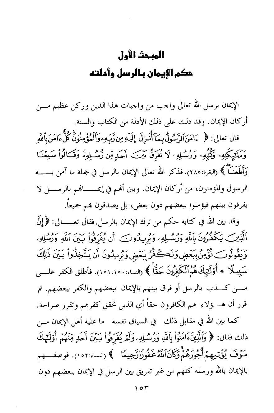 المبحث الأول: حكم الإيمان بالرسل وأدلته الإيمان برسل الله تعالى واجب من واجبات هذا الدين وركن عظيم من أركان الإيمان. وقد دلت على ذلك الأدلة من الكتاب والسنة.