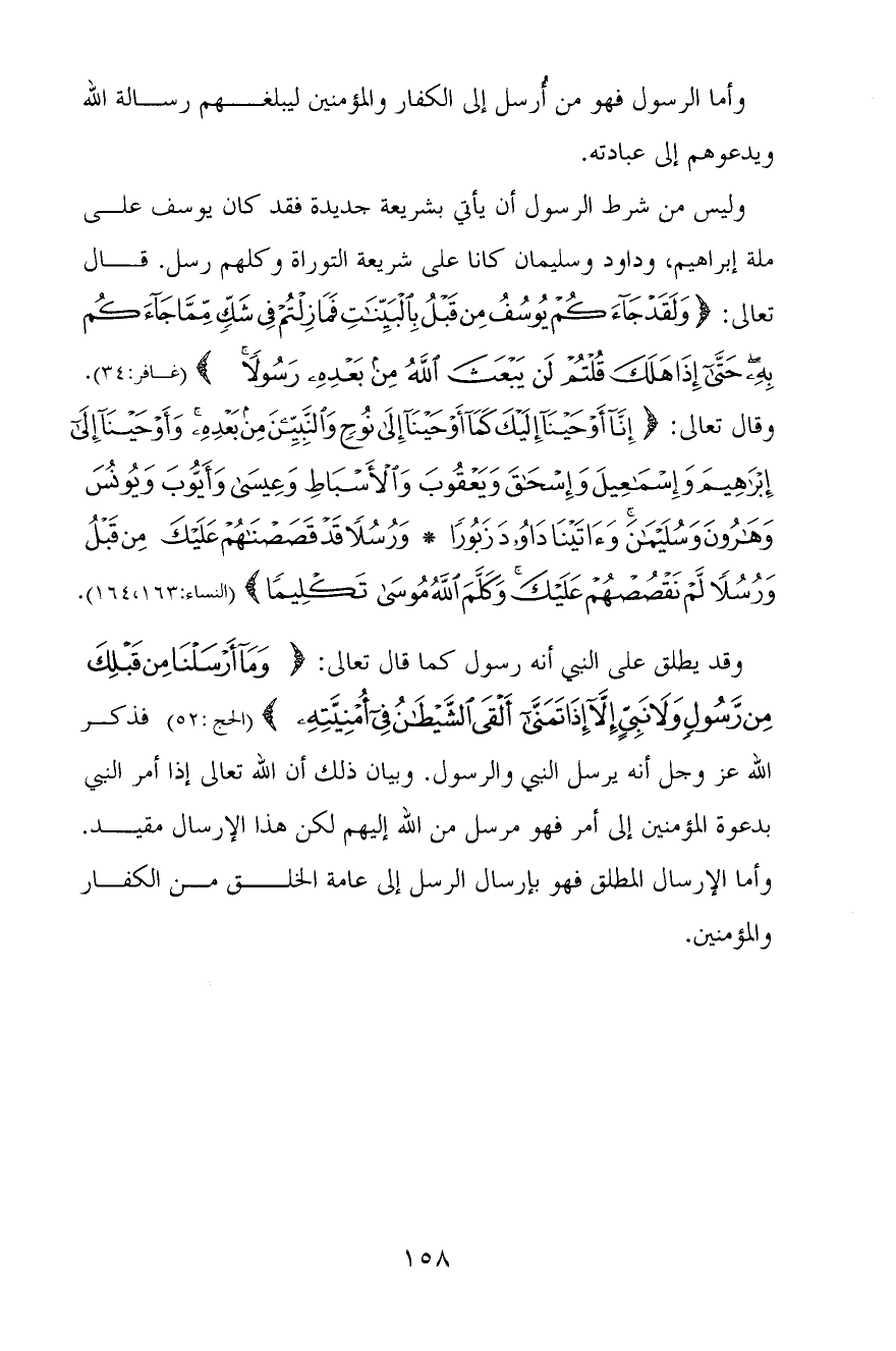 وقد يطلق على النبي أنه رسول كما قال تعالى: {وَمَا أَرْسَلْنَا مِنْ قَبْلِكَ مِنْ رَسُولٍ وَلَا نَبِيٍّ إِلَّا إِذَا تَمَنَّى أَلْقَى الشَّيْطَانُ فِي أُمْنِيَّتِهِ} [الحج: 52] (الحج: 52) فذكر الله عز وجل أنه يرسل النبي والرسول. وبيان ذلك أن الله تعالى إذا أمر النبي بدعوة المؤمنين إلى أمر فهو مرسل من الله إليهم لكن هذا الإرسال مقيد. وأما الإرسال المطلق فهو بإرسال الرسل إلى عامة الخلق من الكفار والمؤمنين.