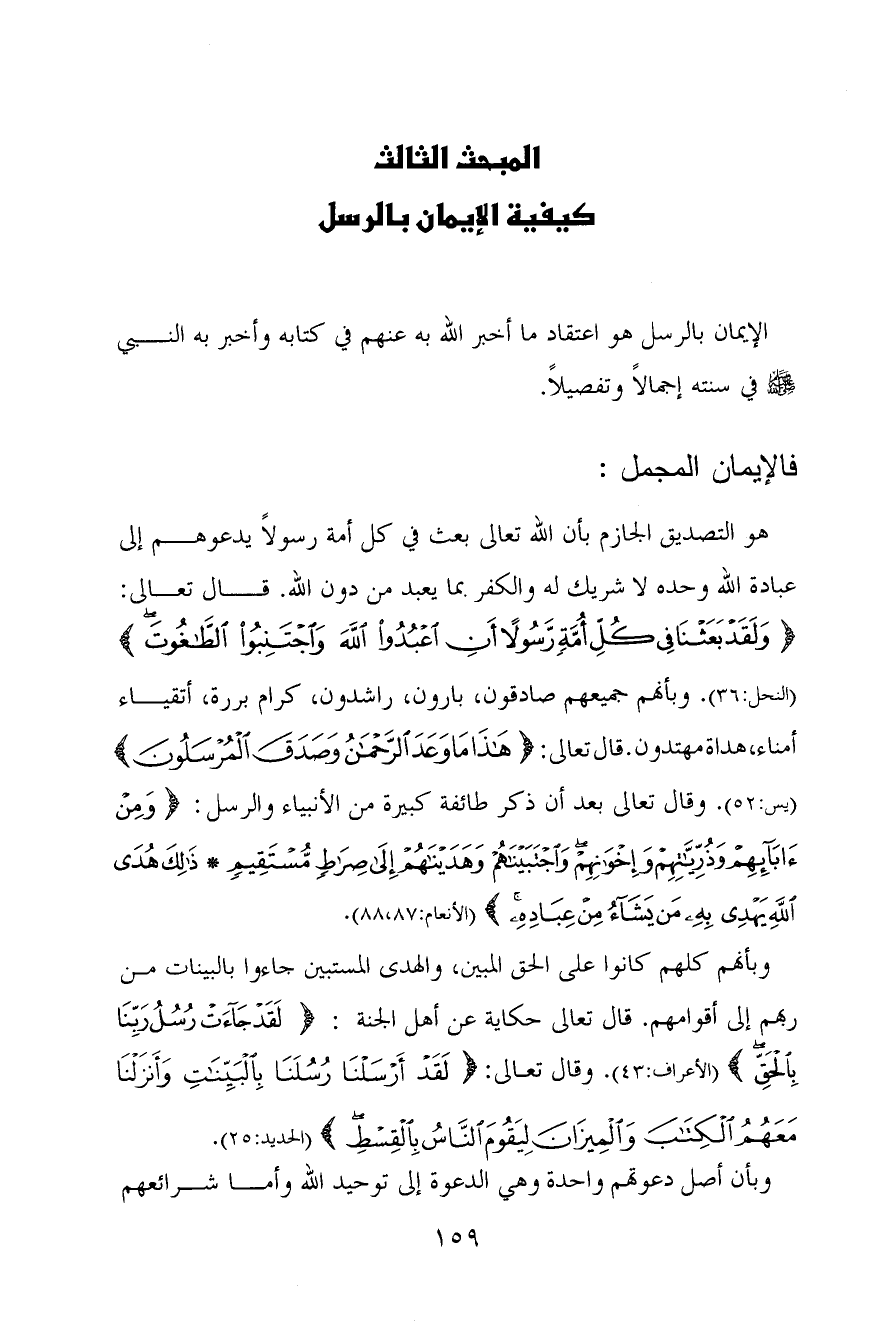 فالإيمان المجمل: هو التصديق الجازم بأن الله تعالى بعث في كل أمة رسولا يدعوهم إلى عبادة الله وحده لا شريك له والكفر بما يعبد من دون الله. قال تعالى: {وَلَقَدْ بَعَثْنَا فِي كُلِّ أُمَّةٍ رَسُولًا أَنِ اُعْبُدُوا اللَّهَ وَاجْتَنِبُوا الطَّاغُوتَ} [النحل: 36] (النحل: 36) . وبأنهم جميعهم صادقون، بارون، راشدون، كرام بررة، أتقياء أمناء، هداة مهتدون. قال تعالى: {هَذَا مَا وَعَدَ الرَّحْمَنُ وَصَدَقَ الْمُرْسَلُونَ} [يس: 52] (يس: 52) . وقال تعالى بعد أن ذكر طائفة كبيرة من الأنبياء والرسل: {وَمِنْ آبَائِهِمْ وَذُرِّيَّاتِهِمْ وَإِخْوَانِهِمْ وَاجْتَبَيْنَاهُمْ وَهَدَيْنَاهُمْ إِلَى صِرَاطٍ مُسْتَقِيمٍ - ذَلِكَ هُدَى اللَّهِ يَهْدِي بِهِ مَنْ يَشَاءُ مِنْ عِبَادِهِ} [الأنعام: 87 - 88] (الأنعام: 87، 88) .