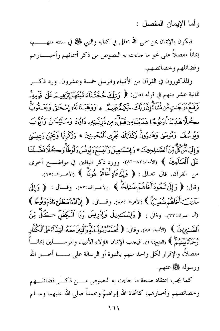 وقال: {وَإِلَى ثَمُودَ أَخَاهُمْ صَالِحًا} [الأعراف: 73] (الأًعراف: 73) . وقال: {وَإِلَى مَدْيَنَ أَخَاهُمْ شُعَيْبًا} [الأعراف: 85] (الأعراف: 85) . وقال: {إِنَّ اللَّهَ اصْطَفَى آدَمَ وَنُوحًا} [آل عمران: 33] (آل عمران: 33) . وقال: {وَإِسْمَاعِيلَ وَإِدْرِيسَ وَذَا الْكِفْلِ كُلٌّ مِنَ الصَّابِرِينَ} [الأنبياء: 85] (الأنبياء: 85) . وقال: {مُحَمَّدٌ رَسُولُ اللَّهِ وَالَّذِينَ مَعَهُ أَشِدَّاءُ عَلَى الْكُفَّارِ رُحَمَاءُ بَيْنَهُمْ} [الفتح: 29] (الفتح: 29) . فيجب الإيمان بهؤلاء الأنبياء والمرسلين إيمانًا مفصلًا، والإقرار لكل واحد منهم بالنبوة أو الرسالة على ما أخبر الله ورسوله صلى الله عليه وسلم عنهم.