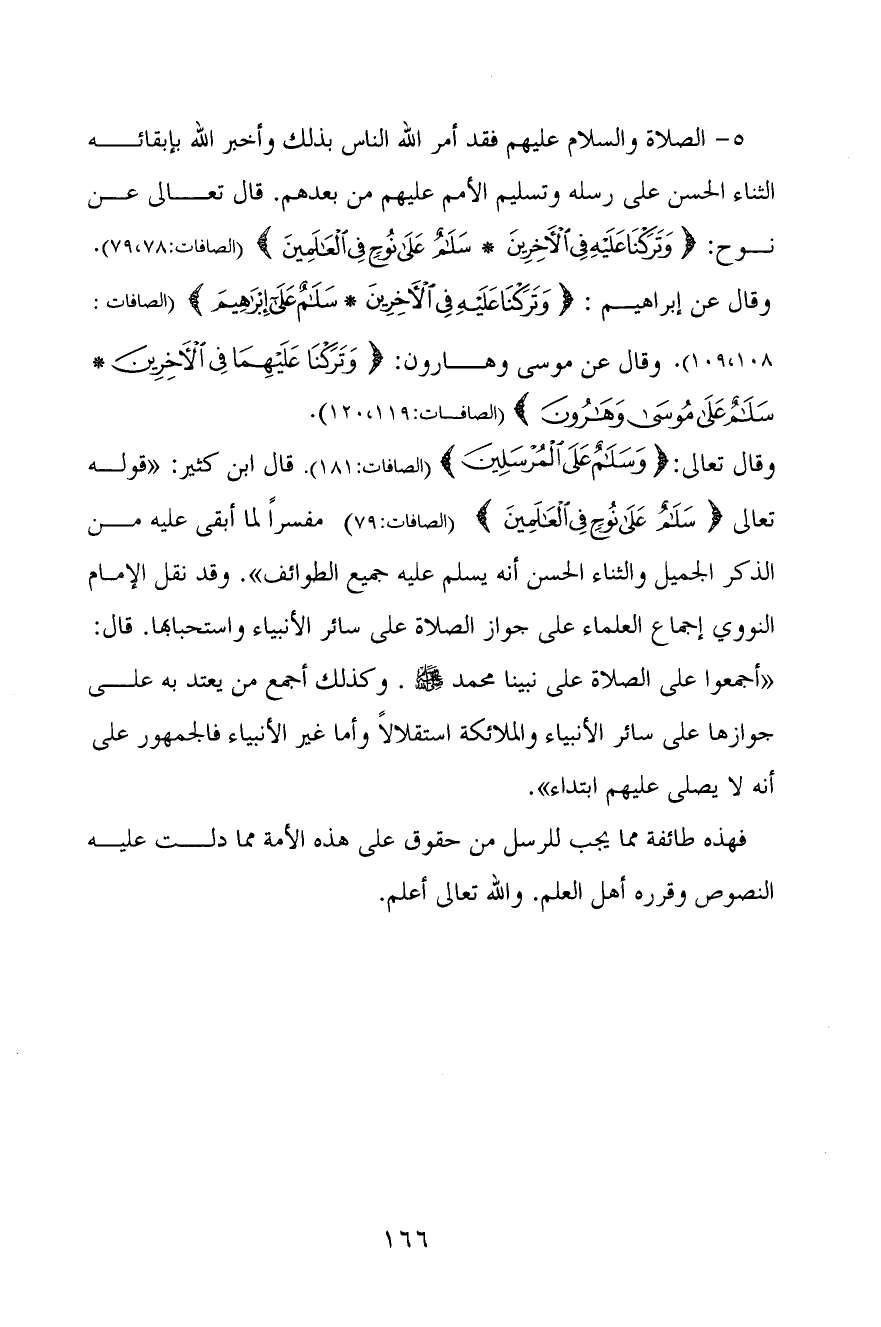 5 - الصلاة والسلام عليهم فقد أمر الله الناس بذلك وأخبر الله بإبقائه الثناء الحسن على رسله وتسليم الأمم عليهم من بعدهم. قال تعالى عن نوح: {وَتَرَكْنَا عَلَيْهِ فِي الْآخِرِينَ - سَلَامٌ عَلَى نُوحٍ فِي الْعَالَمِينَ} [الصافات: 78 - 79] (الصافات: 78، 79) . وقال عن إبراهيم: {وَتَرَكْنَا عَلَيْهِ فِي الْآخِرِينَ - سَلَامٌ عَلَى إِبْرَاهِيمَ} [الصافات: 108 - 109] (الصافات: 108، 109) . وقال عن موسى وهارون: {وَتَرَكْنَا عَلَيْهِمَا فِي الْآخِرِينَ - سَلَامٌ عَلَى مُوسَى وَهَارُونَ} [الصافات: 119 - 120] (الصافات: 119، 120) .