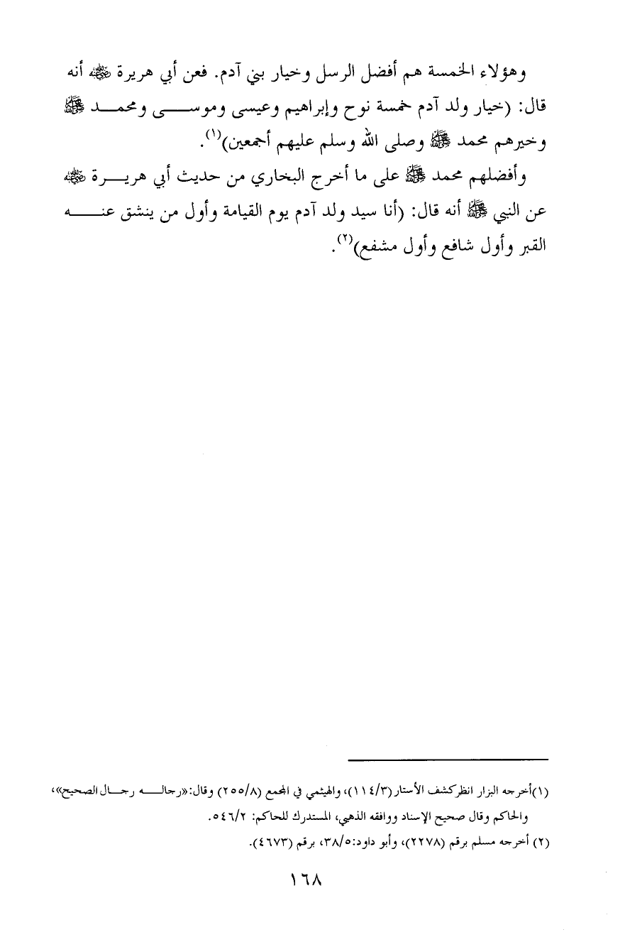 وهؤلاء الخمسة هم أفضل الرسل وخيار بني آدم. فعن أبي هريرة رضي الله عنه أنه قال: (خيار ولد آدم خمسة نوح وإبراهيم وعيسى وموسى ومحمد صلى الله عليه وسلم وخيرهم محمد صلى الله عليه وسلم وصلى الله وسلم عليهم أجمعين) (¬1) .