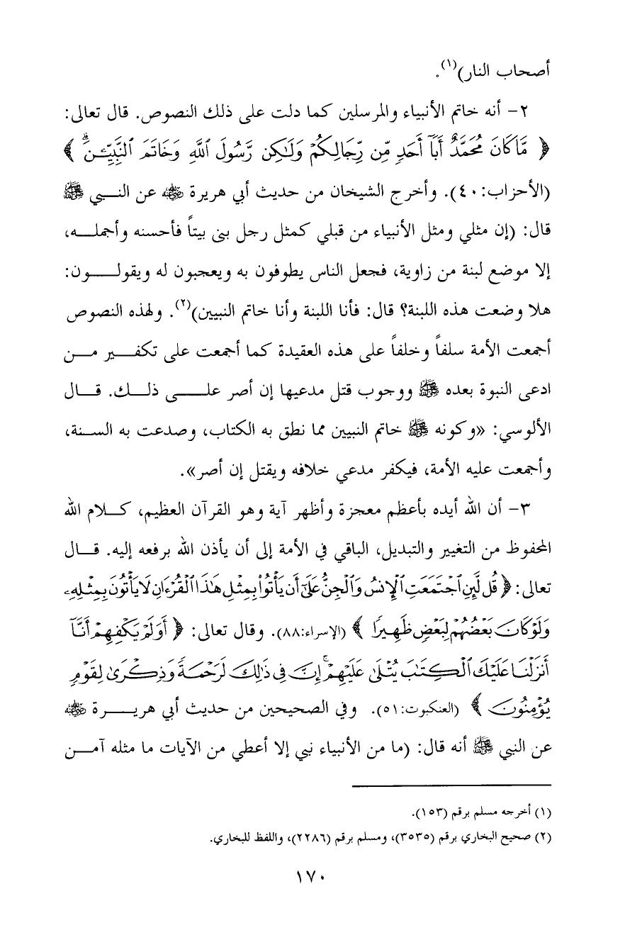 2 - أنه خاتم الأنبياء والمرسلين كما دلت على ذلك النصوص. قال تعالى: {مَا كَانَ مُحَمَّدٌ أَبَا أَحَدٍ مِنْ رِجَالِكُمْ وَلَكِنْ رَسُولَ اللَّهِ وَخَاتَمَ النَّبِيِّينَ} [الأحزاب: 40] (الأحزاب: 40) . وأخرج الشيخان من حديث أبي هريرة رضي الله عنه عن النبي صلى الله عليه وسلم قال: « (إن مثلي ومثل الأنبياء من قبلي كمثل رجل بنى بيتًا فأحسنه وأجمله، إلا موضع لبنة من زاوية، فجعل الناس يطوفون به ويعجبون له ويقولون: هلا وضعت هذه اللبنة؟ قال: فأنا اللبنة وأنا خاتم النبيين» (¬2) . ولهذه النصوص أجمعت الأمة سلفًا وخلفًا على هذه العقيدة كما أجمعت على تكفير من ادعى النبوة بعده صلى الله عليه وسلم ووجوب قتل مدعيها إن أصر على ذلك. قال الألوسي: " وكونه صلى الله عليه وسلم خاتم النبيين مما نطق به الكتاب، وصدعت به السنة، وأجمعت عليه الأمة، فيكفر مدعي خلافه ويقتل إن أصر ".