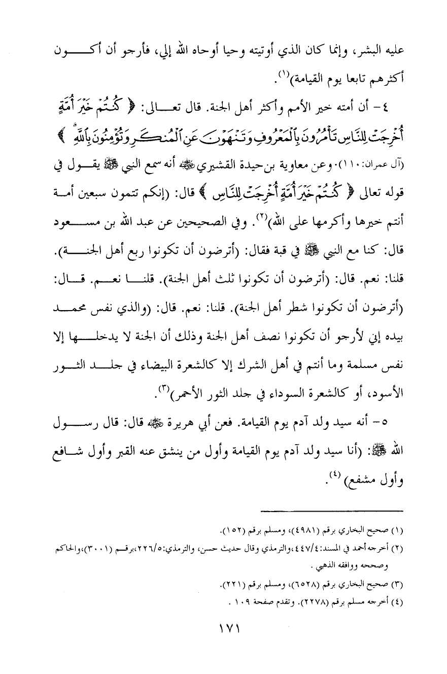 4 - أن أمته خير الأمم وأكثر أهل الجنة. قال تعالى: {كُنْتُمْ خَيْرَ أُمَّةٍ أُخْرِجَتْ لِلنَّاسِ تَأْمُرُونَ بِالْمَعْرُوفِ وَتَنْهَوْنَ عَنِ الْمُنْكَرِ وَتُؤْمِنُونَ بِاللَّهِ} [آل عمران: 110] (آل عمران: 110) . وعن معاوية بن حيدة القشيري رضي الله عنه أنه سمع النبي صلى الله عليه وسلم يقول في قوله تعالى {كُنْتُمْ خَيْرَ أُمَّةٍ أُخْرِجَتْ لِلنَّاسِ} [آل عمران: 110] قال: «إنكم تتمون سبعين أمة أنتم خيرها وأكرمها على الله» (¬2) . وفي الصحيحين عن عبد الله بن مسعود قال: «كنا مع النبي صلى الله عليه وسلم في قبة فقال: (أترضون أن تكونوا ربع أهل الجنة) . قلنا: نعم. قال: (أترضون أن تكونوا ثلث أهل الجنة) . قلنا نعم. قال: (أترضون أن تكونوا شطر أهل الجنة) . قلنا: نعم. قال: (والذي نفس محمد بيده إني لأرجو أن تكونوا نصف أهل الجنة وذلك أن الجنة لا يدخلها إلا نفس مسلمة وما أنتم في أهل الشرك إلا كالشعرة البيضاء في جلد الثور الأسود، أو كالشعرة السوداء في جلد الثور الأحمر) » (¬3) .