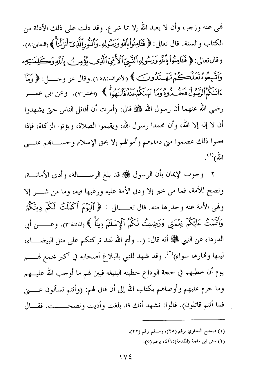 نهى عنه وزجر، وأن لا يعبد الله إلا بما شرع. وقد دلت على ذلك الأدلة من الكتاب والسنة. قال تعالى: {فَآمِنُوا بِاللَّهِ وَرَسُولِهِ وَالنُّورِ الَّذِي أَنْزَلْنَا} [التغابن: 8] (التغابن: 8) . وقال تعالى: {فَآمِنُوا بِاللَّهِ وَرَسُولِهِ النَّبِيِّ الْأُمِّيِّ الَّذِي يُؤْمِنُ بِاللَّهِ وَكَلِمَاتِهِ وَاتَّبِعُوهُ لَعَلَّكُمْ تَهْتَدُونَ} [الأعراف: 158] (الأعراف: 158) . وقال عز وجل: {وَمَا آتَاكُمُ الرَّسُولُ فَخُذُوهُ وَمَا نَهَاكُمْ عَنْهُ فَانْتَهُوا} [الحشر: 7] (الحشر: 7) . وعن ابن عمر رضي الله عنهما أن رسول الله صلى الله عليه وسلم قال: «أمرت أن أقاتل الناس حتى يشهدوا أن لا إله إلا الله، وأن محمدا رسول الله، ويقيموا الصلاة، ويؤتوا الزكاة، فإذا فعلوا ذلك عصموا مني دماءهم وأموالهم إلا بحق الإسلام وحسابهم على الله» (¬1) .