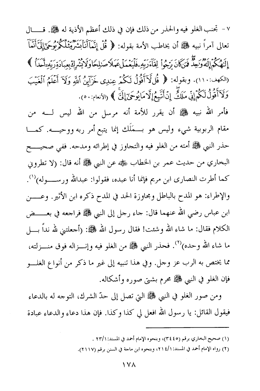 7 - تجنب الغلو فيه والحذر من ذلك فإن في ذلك أعظم الأذية له صلى الله عليه وسلم. قال تعالى آمرًا نبيه صلى الله عليه وسلم أن يخاطب الأمة بقوله: {قُلْ إِنَّمَا أَنَا بَشَرٌ مِثْلُكُمْ يُوحَى إِلَيَّ أَنَّمَا إِلَهُكُمْ إِلَهٌ وَاحِدٌ فَمَنْ كَانَ يَرْجُوا لِقَاءَ رَبِّهِ فَلْيَعْمَلْ عَمَلًا صَالِحًا وَلَا يُشْرِكْ بِعِبَادَةِ رَبِّهِ أَحَدًا} [الكهف: 110] (الكهف: 110) . وبقوله: {قُلْ لَا أَقُولُ لَكُمْ عِنْدِي خَزَائِنُ اللَّهِ وَلَا أَعْلَمُ الْغَيْبَ وَلَا أَقُولُ لَكُمْ إِنِّي مَلَكٌ إِنْ أَتَّبِعُ إِلَّا مَا يُوحَى إِلَيَّ} [الأنعام: 50] (الأنعام: 50) .