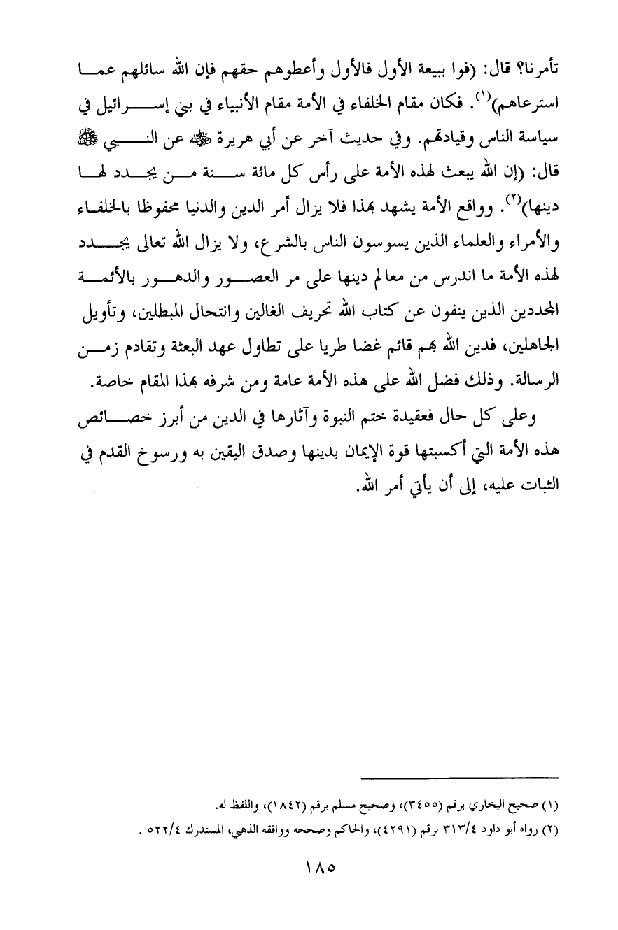 تأمرنا؟ قال: (فوا ببيعة الأول فالأول وأعطوهم حقهم فإن الله سائلهم عما استرعاهم) » (¬1) . فكان مقام الخلفاء في الأمة مقام الأنبياء في بني إسرائيل في سياسة الناس وقيادتهم. وفي حديث آخر عن أبي هريرة رضي الله عنه عن النبي صلى الله عليه وسلم قال: «إن الله يبعث لهذه الأمة على رأس كل مائة سنة من يجدد لها دينها» (¬2) . وواقع الأمة يشهد بهذا فلا يزال أمر الدين والدنيا محفوظا بالخلفاء والأمراء والعلماء الذين يسوسون الناس بالشرع، ولا يزال الله تعالى يجدد لهذه الأمة ما اندرس من معالم دينها على مر العصور والدهور بالأئمة المجددين الذين ينفون عن كتاب الله تحريف الغالين وانتحال المبطلين، وتأويل الجاهلين، فدين الله بهم قائم غضا طريا على تطاول عهد البعثة وتقادم زمن الرسالة. وذلك فضل الله على هذه الأمة عامة ومن شرفه بهذا المقام خاصة.