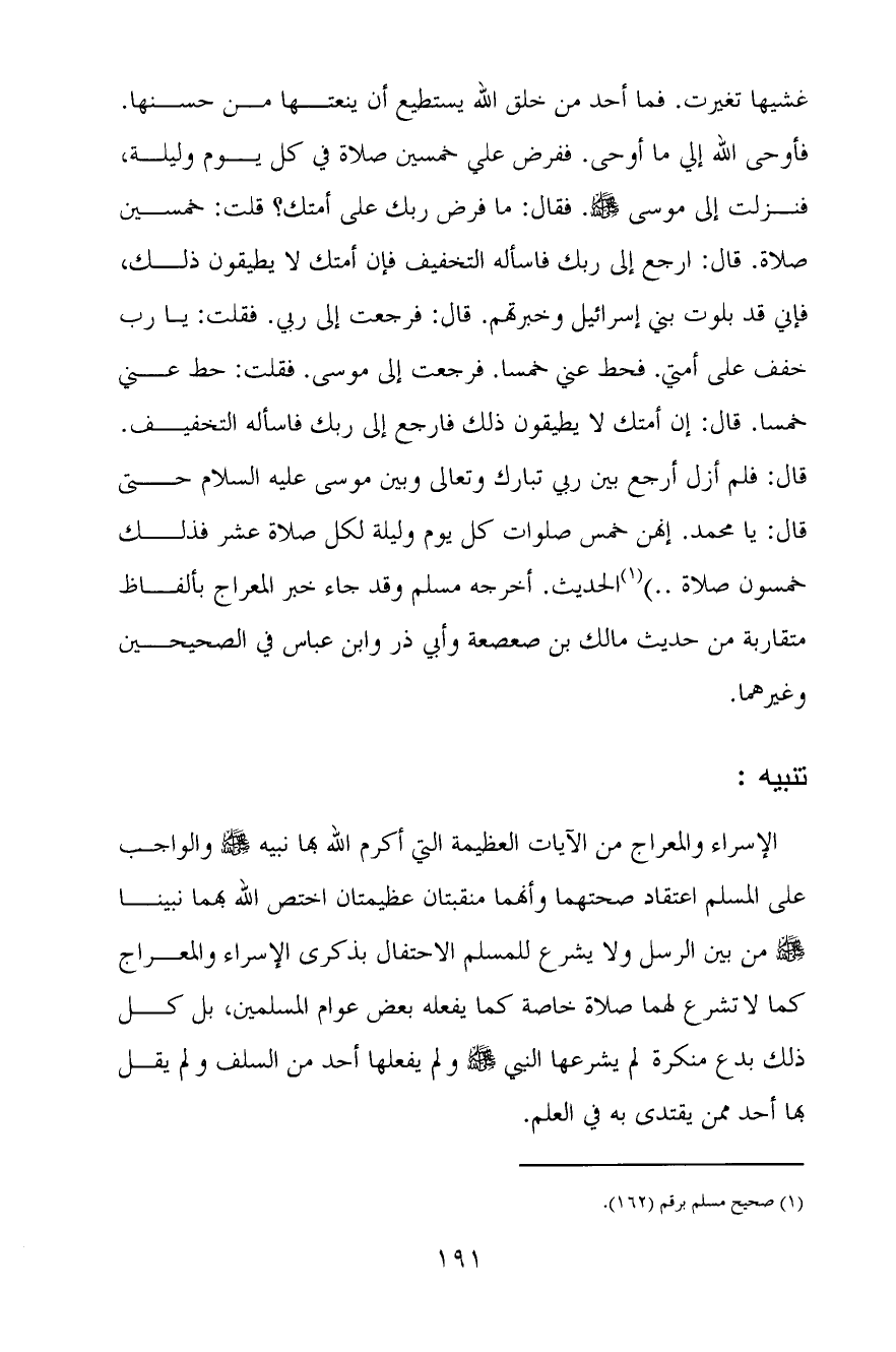 تنبيه: الإسراء والمعراج من الآيات العظيمة التي أكرم الله بها نبيه صلى الله عليه وسلم والواجب على المسلم اعتقاد صحتهما وأنهما منقبتان عظيمتان اختص الله بهما نبينا صلى الله عليه وسلم من بين الرسل ولا يشرع للمسلم الاحتفال بذكرى الإسراء والمعراج كما لا تشرع لهما صلاة خاصة كما يفعله بعض عوام المسلمين، بل كل ذلك بدع منكرة لم يشرعها النبي صلى الله عليه وسلم ولم يفعلها أحد من السلف ولم يقل بها أحد ممن يقتدي به في العلم.