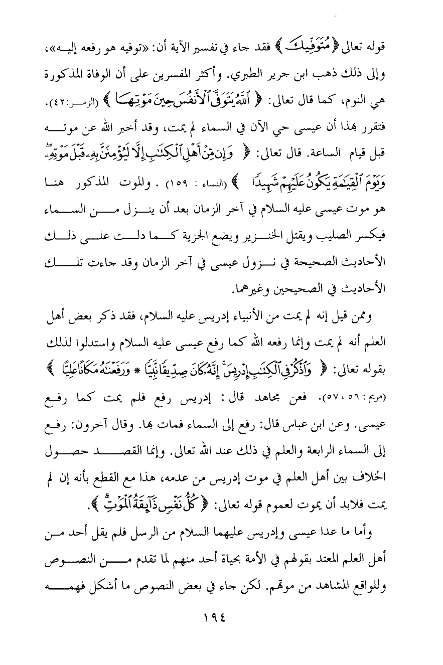 قوله تعالى {مُتَوَفِّيكَ} [آل عمران: 55] فقد جاء في تفسير الآية أن: " توفيه هو رفعه إليه "، وإلى ذلك ذهب ابن جرير الطبري. وأكثر المفسرين على أن الوفاة المذكورة هي النوم، كما قال تعالى: {اللَّهُ يَتَوَفَّى الْأَنْفُسَ حِينَ مَوْتِهَا} [الزمر: 42] (الزمر: 42) .