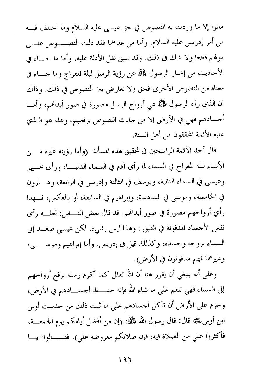 وعلى أنه ينبغي أن يقرر هنا أن الله تعالى كما أكرم رسله برفع أرواحهم إلى السماء فهي تنعم على ما شاء الله فإنه حفظ أجسادهم في الأرض، وحرم على الأرض أن تأكل أجسادهم على ما ثبت ذلك من حديث أوس بن أوس رضي الله عنه قال: قال رسول الله صلى الله عليه وسلم: «إن من أفضل أيامكم يوم الجمعة، فأكثروا علي من الصلاة فيه، فإن صلاتكم معروضة علي» . فقالوا: يا