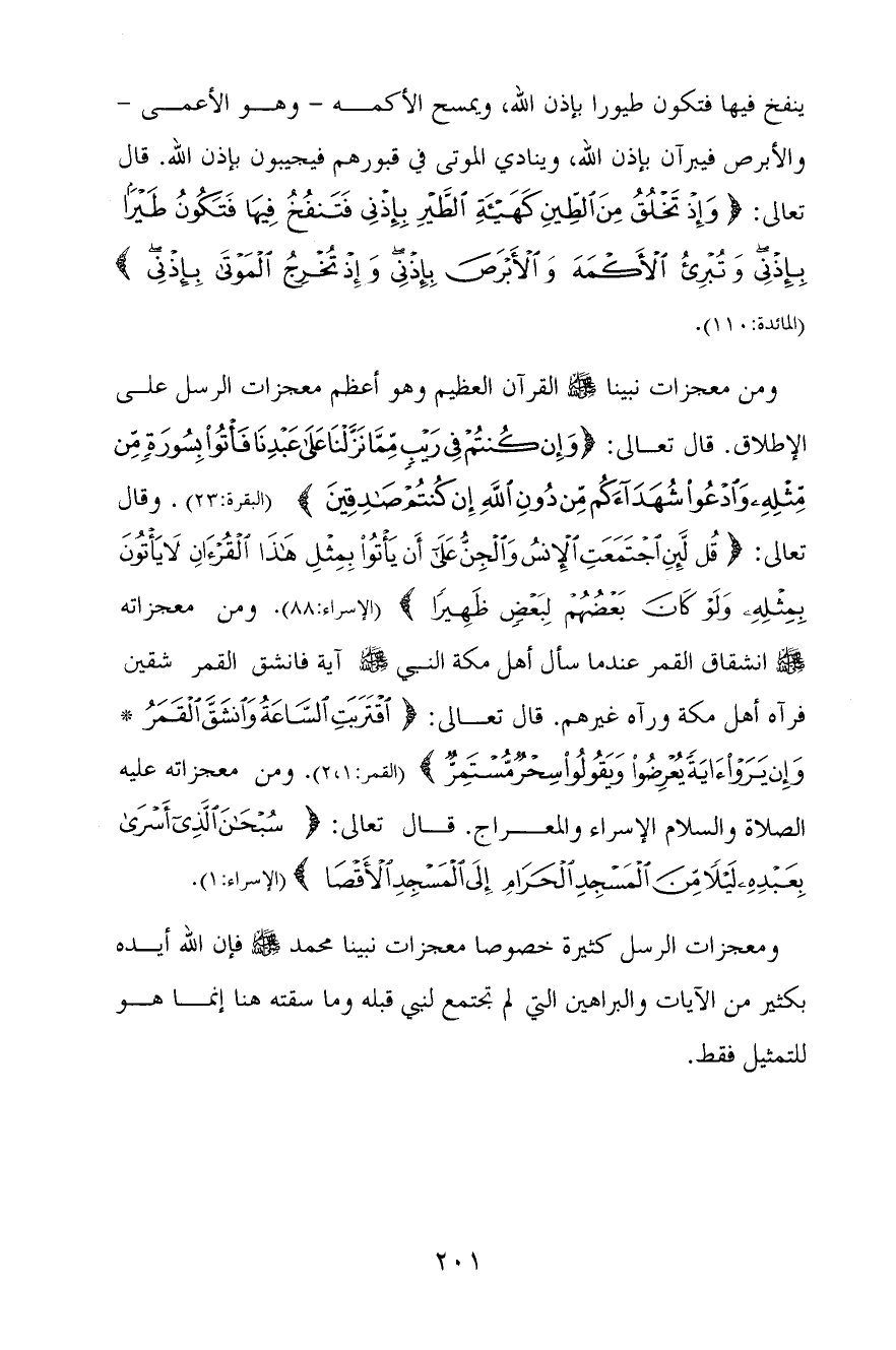 ومن معجزات نبينا صَلَّى اللَّهُ عَلَيْهِ وَسَلِّم القرآن العظيم وهو أعظم معجزات الرسل على الإطلاق. قال تعالى: {وَإِنْ كُنْتُمْ فِي رَيْبٍ مِمَّا نَزَّلْنَا عَلَى عَبْدِنَا فَأْتُوا بِسُورَةٍ مِنْ مِثْلِهِ وَادْعُوا شُهَدَاءَكُمْ مِنْ دُونِ اللَّهِ إِنْ كُنْتُمْ صَادِقِينَ} [البقرة: 23] (البقرة: 23) . وقال تعالى: {قُلْ لَئِنِ اجْتَمَعَتِ الْإِنْسُ وَالْجِنُّ عَلَى أَنْ يَأْتُوا بِمِثْلِ هَذَا الْقُرْآنِ لَا يَأْتُونَ بِمِثْلِهِ وَلَوْ كَانَ بَعْضُهُمْ لِبَعْضٍ ظَهِيرًا} [الإسراء: 88] (الإسراء: 88) . ومن معجزاته صَلَّى اللَّهُ عَلَيْهِ وَسَلِّم انشقاق القمر عندما سأل أهل مكة النبي صَلَّى اللَّهُ عَلَيْهِ وَسَلِّم آية فانشق القمر شقين فرآه أهل مكة ورآه غيرهم. قال تعالى: {اقْتَرَبَتِ السَّاعَةُ وَانْشَقَّ الْقَمَرُ - وَإِنْ يَرَوْا آيَةً يُعْرِضُوا وَيَقُولُوا سِحْرٌ مُسْتَمِرٌّ} [القمر: 1 - 2] (القمر: 1، 2) . ومن معجزاته عليه الصلاة والسلام الإسراء والمعراج. قال تعالى: {سُبْحَانَ الَّذِي أَسْرَى بِعَبْدِهِ لَيْلًا مِنَ الْمَسْجِدِ الْحَرَامِ إِلَى الْمَسْجِدِ الْأَقْصَى} [الإسراء: 1] (الإسراء: 1) .