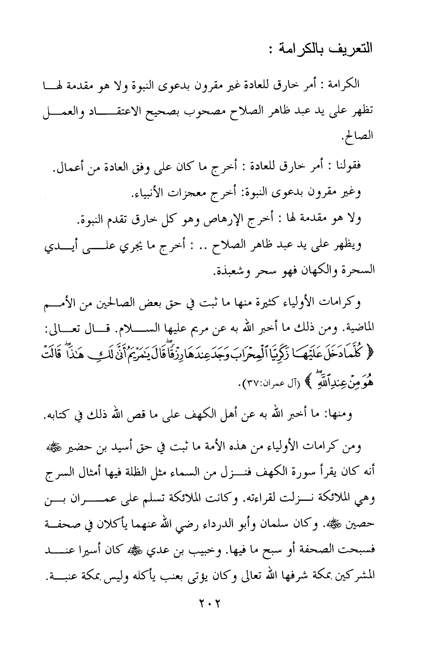 التعريف بالكرامة: الكرامة: أمر خارق للعادة غير مقرون بدعوى النبوة ولا هو مقدمة لها تظهر على يد عبد ظاهر الصلاح مصحوب بصحيح الاعتقاد والعمل الصالح.