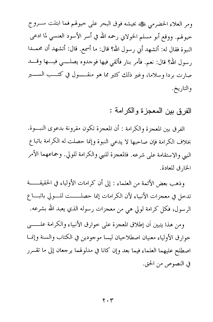ومر العلاء الحضرمي رضي الله عنه بجيشه فوق البحر على خيولهم فما ابتلت سروج خيولهم. ووقع أبو مسلم الخولاني رحمه الله في أسر الأسود العنسي لما ادعى النبوة فقال له: أتشهد أني رسول الله؟ قال: ما أسمع. قال: أتشهد أن محمدا رسول الله؟ قال: نعم. فأمر بنار فألقي فيها فوجدوه يصلي فيها وقد صارت بردا وسلاما، وغير ذلك كثير مما هو منقول في كتب السير والتاريخ.
