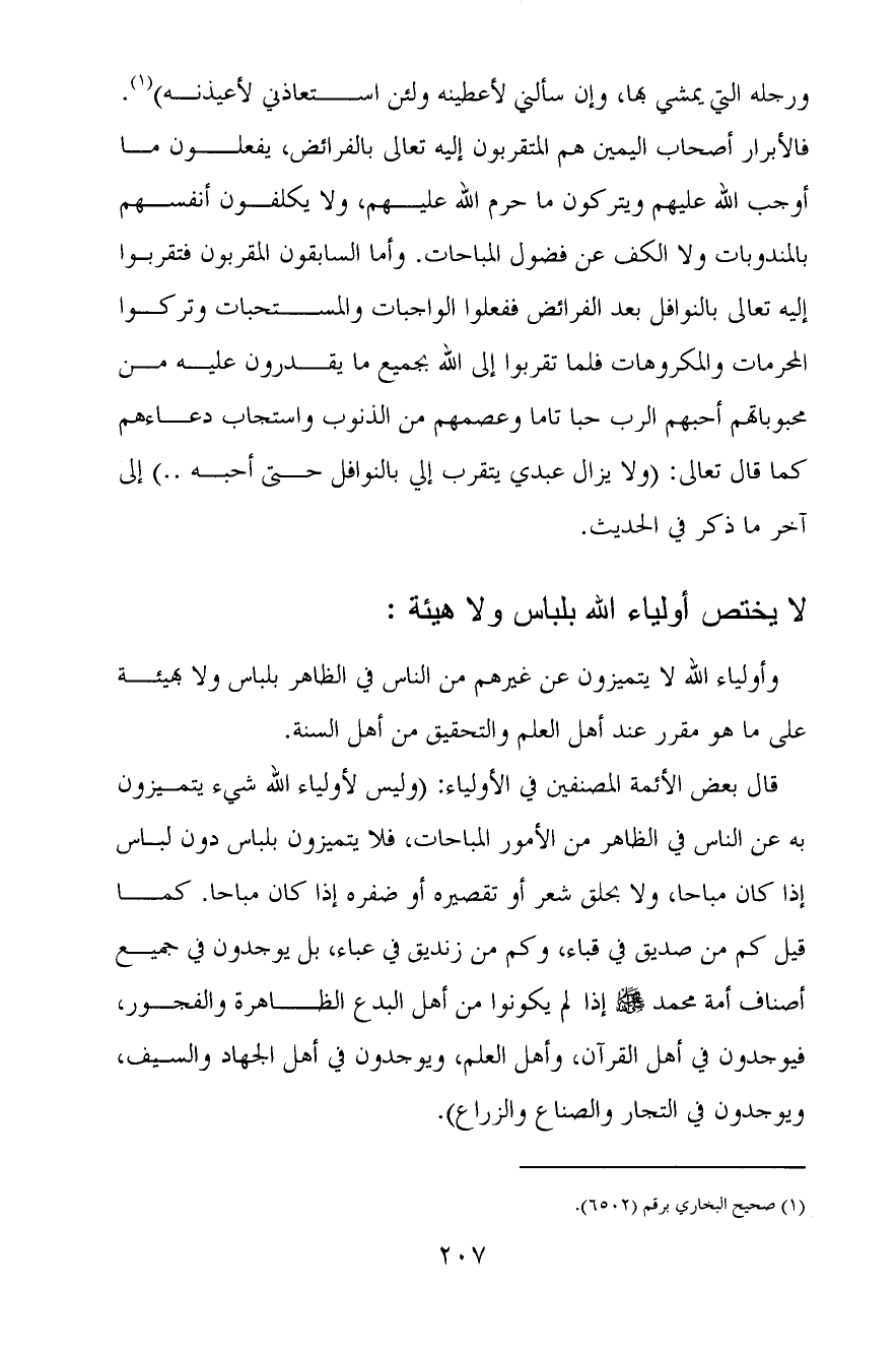 لا يختص أولياء الله بلباس ولا هيئة: وأولياء الله لا يتميزون عن غيرهم من الناس في الظاهر بلباس ولا بهيئة على ما هو مقرر عند أهل العلم والتحقيق من أهل السنة.