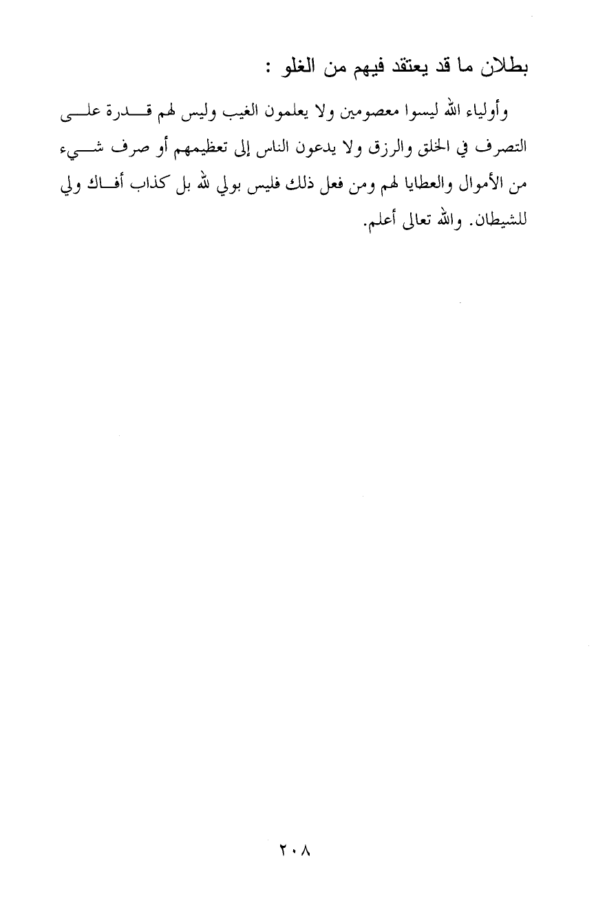 بطلان ما قد يعتقد فيهم من الغلو: وأولياء الله ليسوا معصومين ولا يعلمون الغيب وليس لهم قدرة على التصرف في الخلق والرزق ولا يدعون الناس إلى تعظيمهم أو صرف شيء من الأموال والعطايا لهم ومن فعل ذلك فليس بولي لله بل كذاب أفاك ولي للشيطان. والله تعالى أعلم.